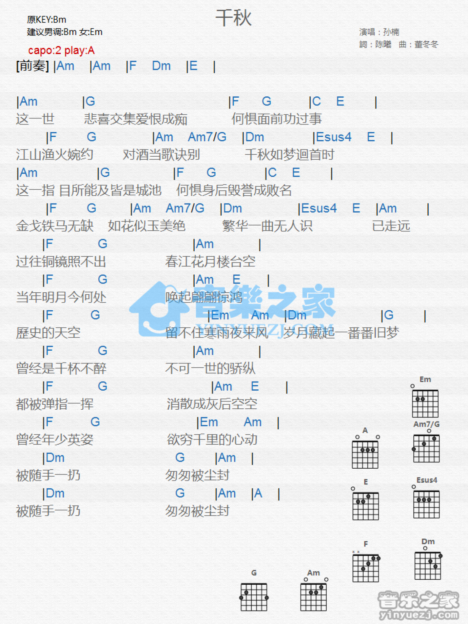 曲谱介绍: A调版 孙楠《千秋》吉他和弦弹唱谱