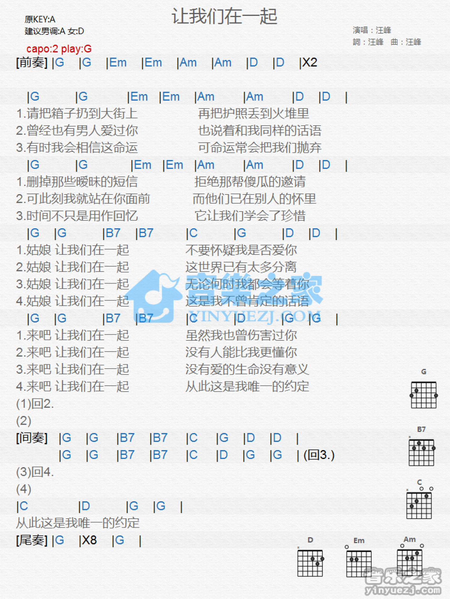 曲谱介绍: G调版 汪峰《让我们在一起》吉他和弦弹唱谱