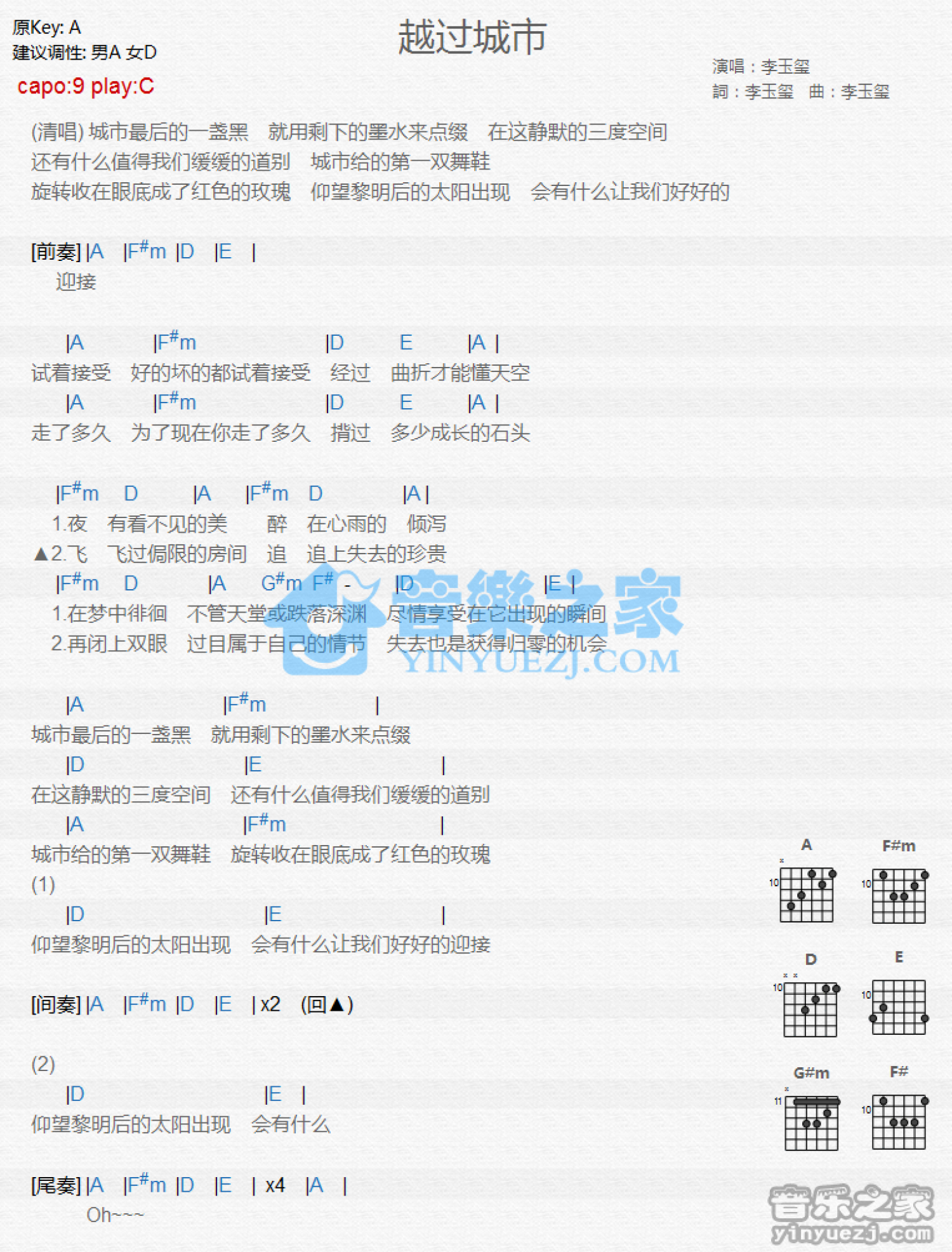 曲谱介绍: C调版 李玉玺《越过城市》吉他和弦弹唱谱