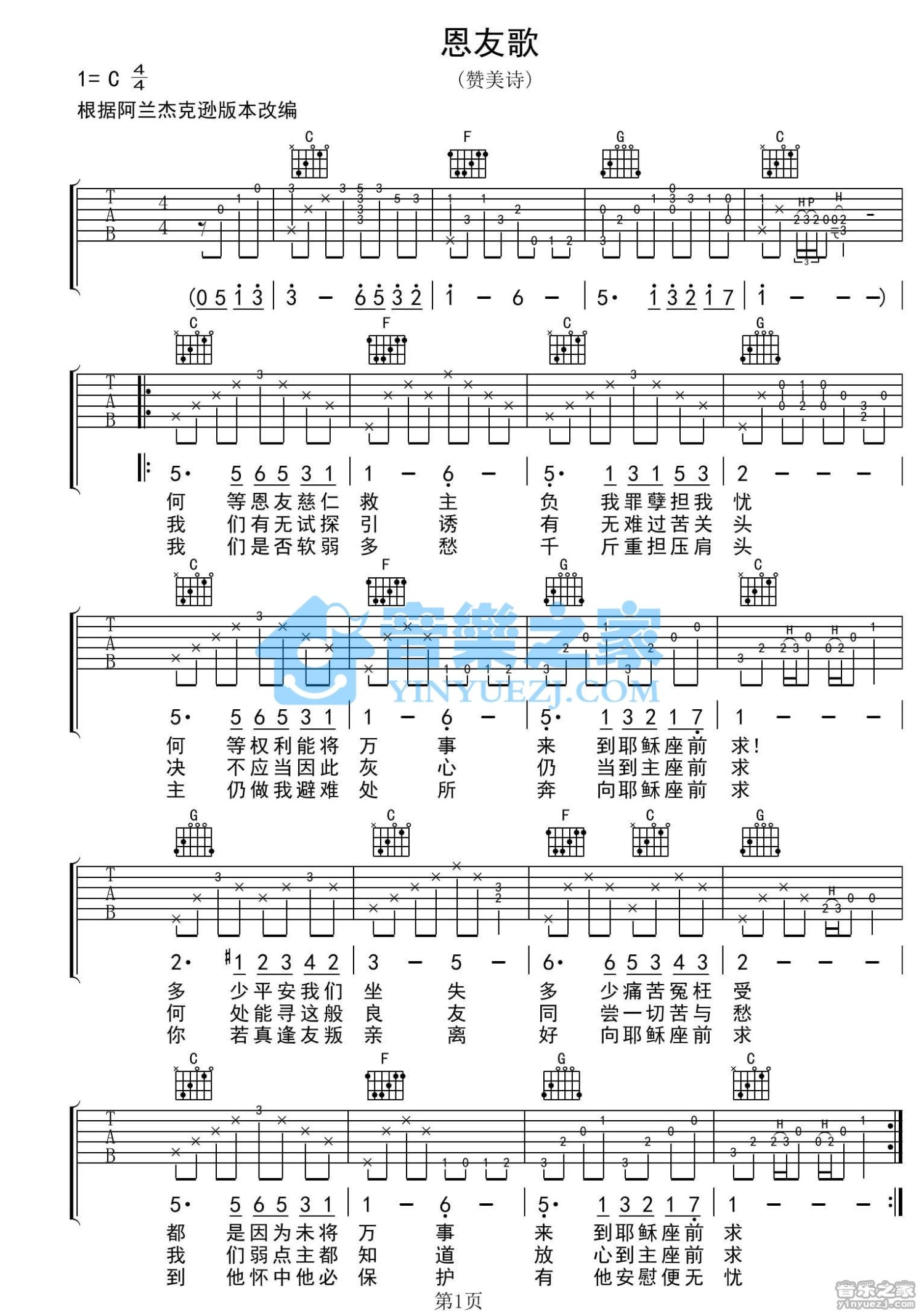 曲谱介绍: C调版 赞美诗《恩友歌》吉他弹唱六线谱