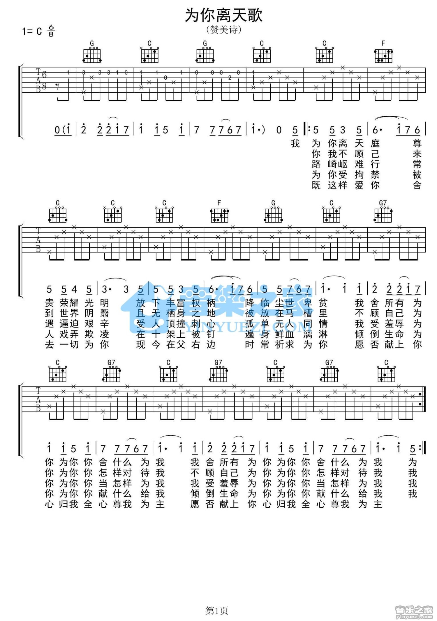 曲谱介绍: C调版 赞美诗《为你离天歌》吉他弹唱六线谱