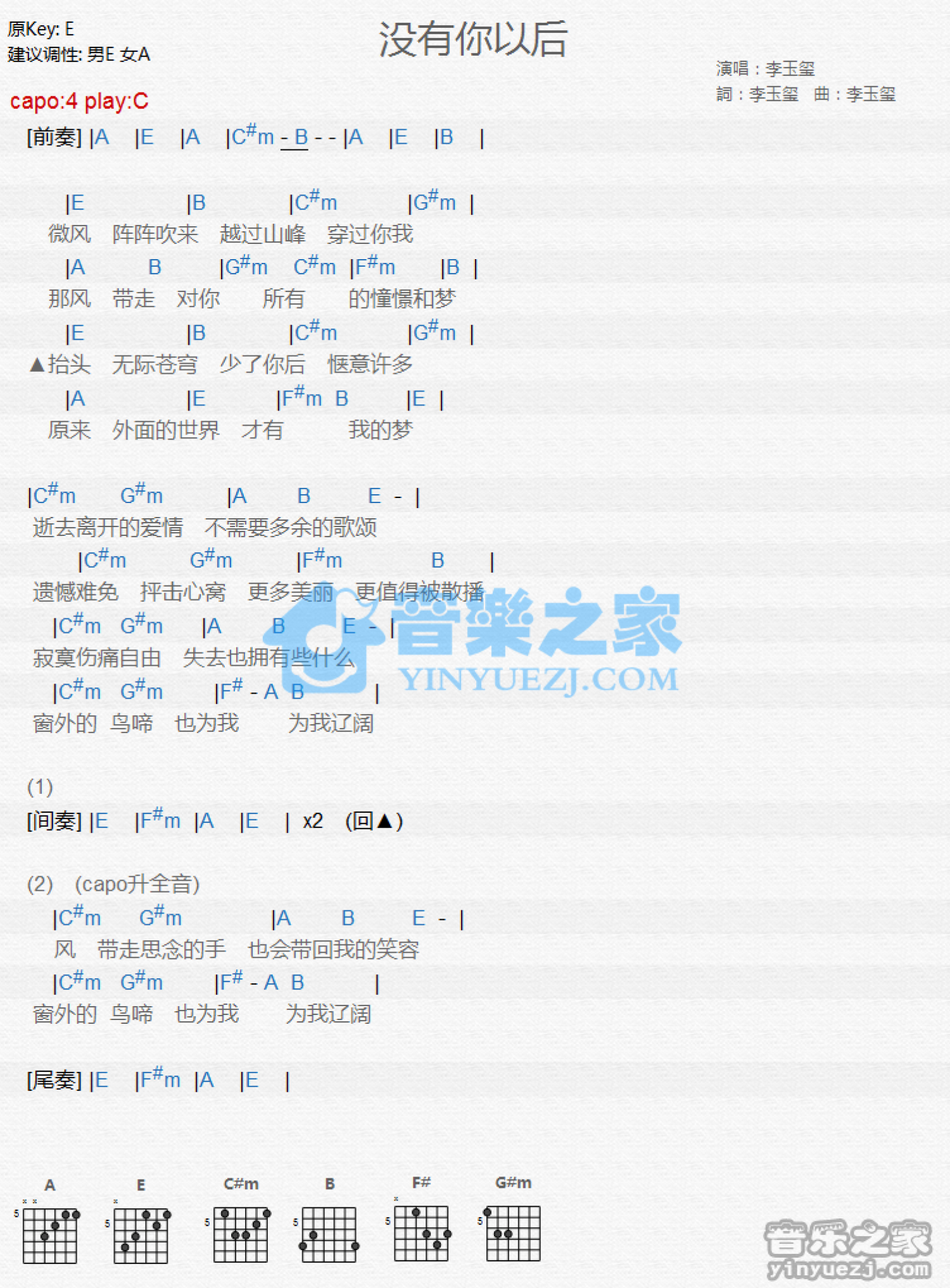 曲谱介绍: C调版 李玉玺《没有你以后》吉他和弦弹唱谱