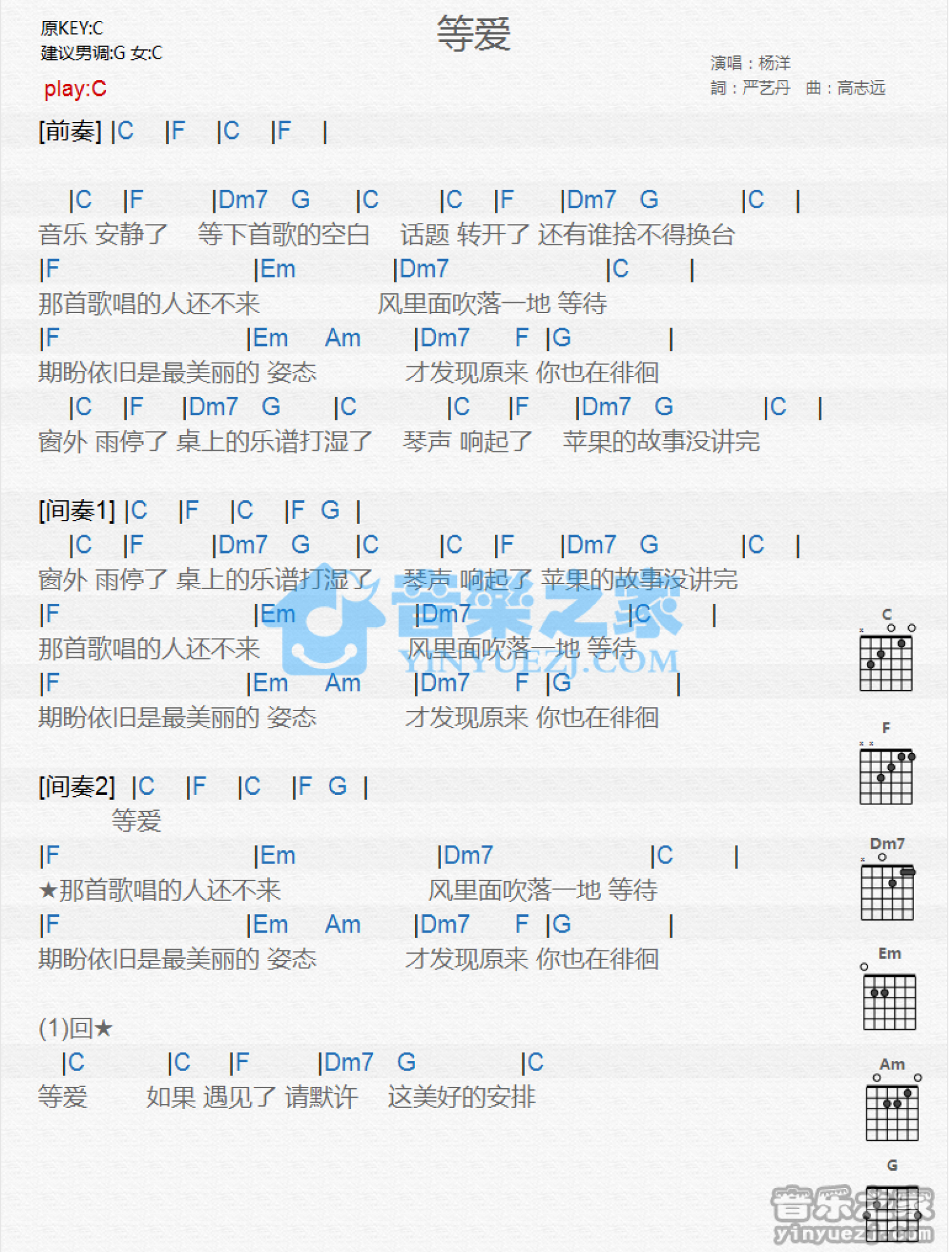 曲谱介绍: C调版 杨洋《等爱》吉他和弦弹唱谱