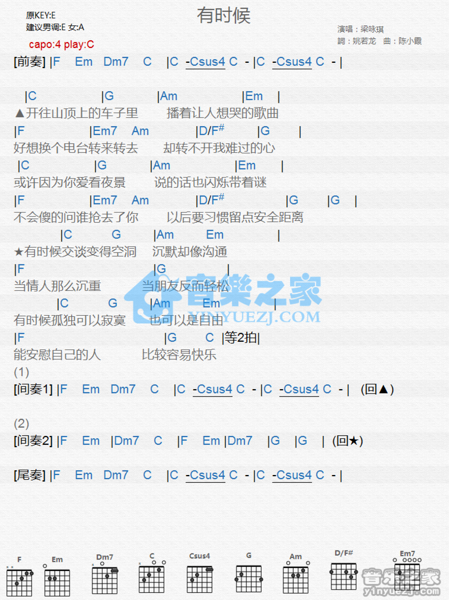 曲谱介绍: C调版 梁咏琪《有时候》吉他和弦弹唱谱