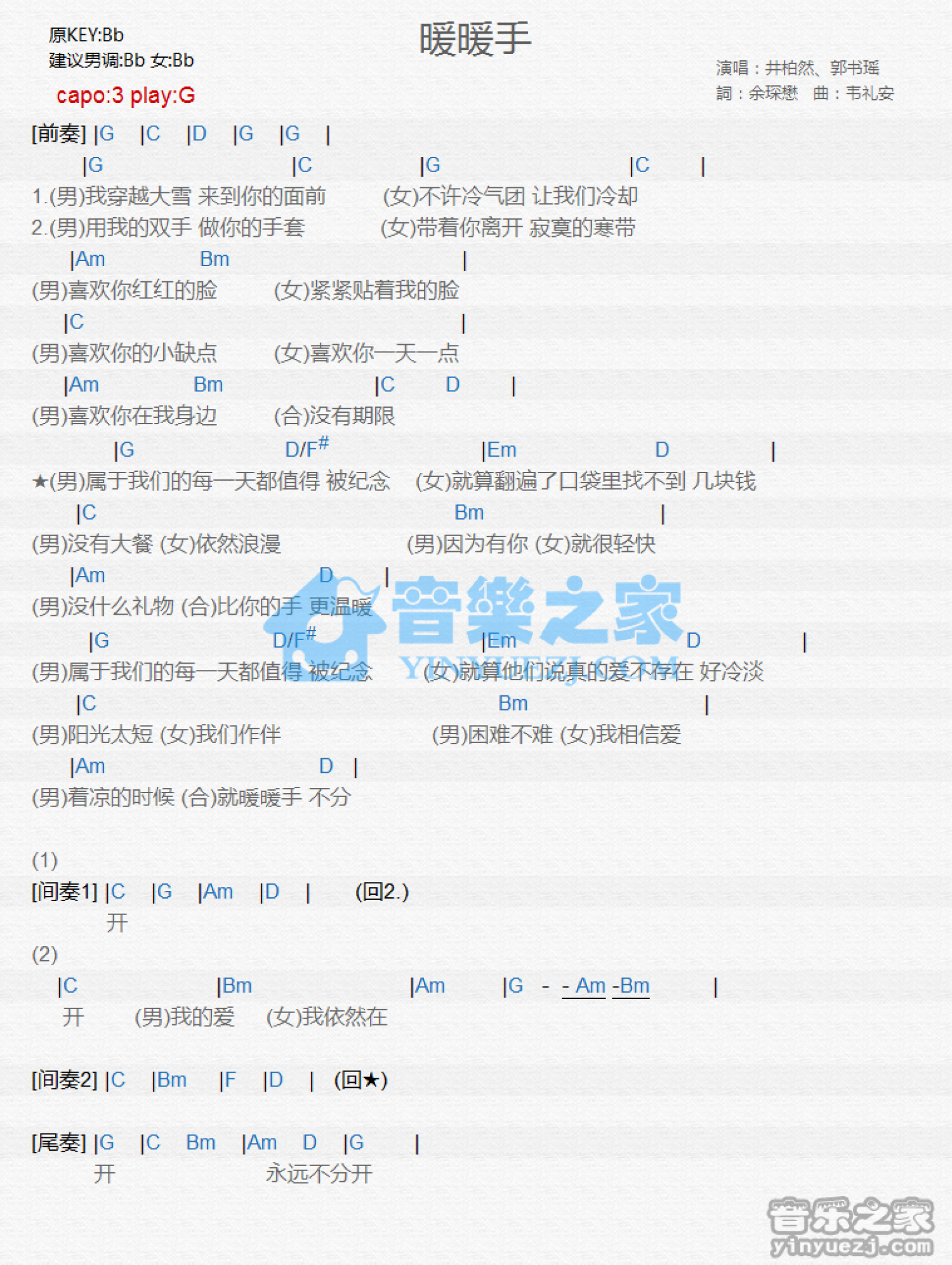 曲谱介绍: G调版 井柏然/郭书瑶《暖暖手》吉他和弦弹唱谱