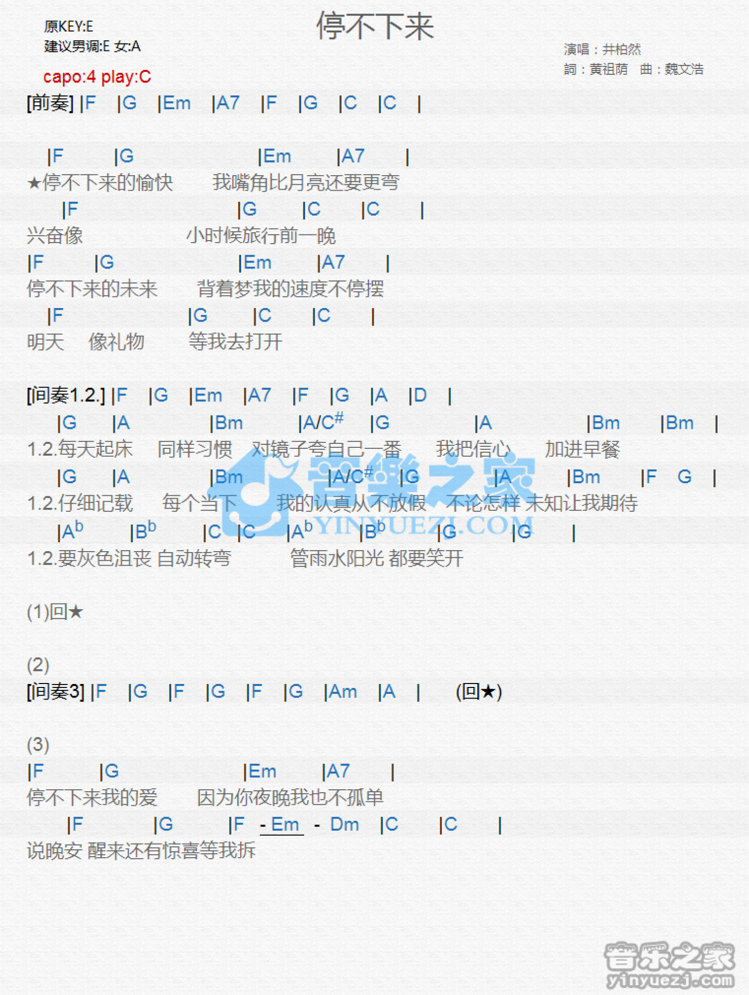 曲谱介绍: C调版 井柏然《停不下来》吉他和弦弹唱谱