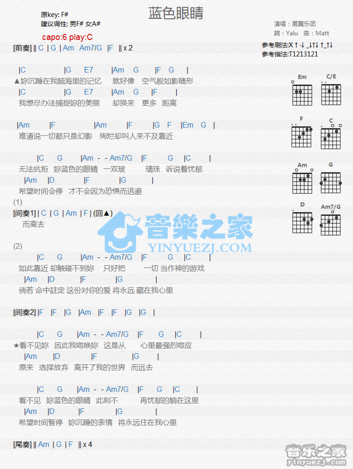 曲谱介绍: C调版 展翼乐团《蓝色眼睛》吉他和弦弹唱谱