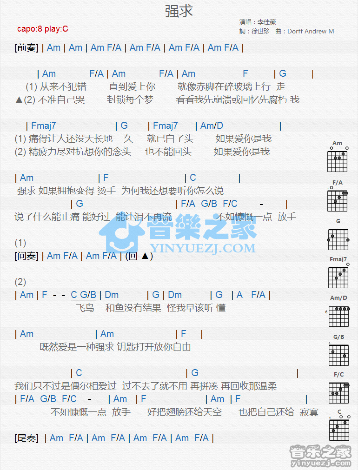 曲谱介绍: C调版 李佳薇《强求》吉他和弦弹唱谱