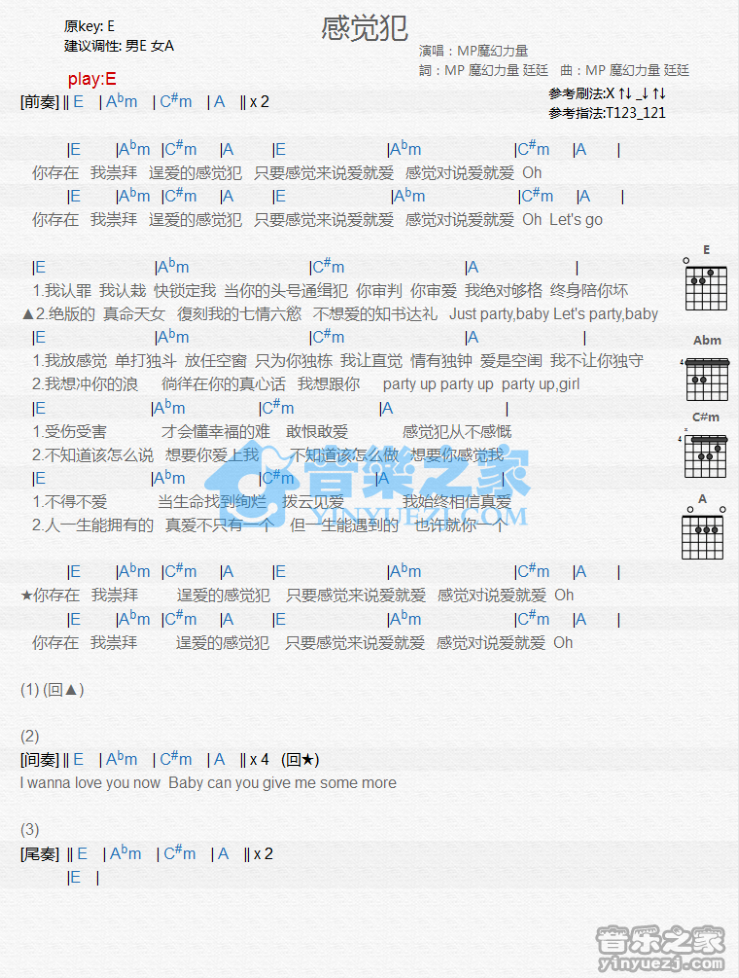 曲谱介绍: E调版 MP《感觉犯》吉他和弦弹唱谱