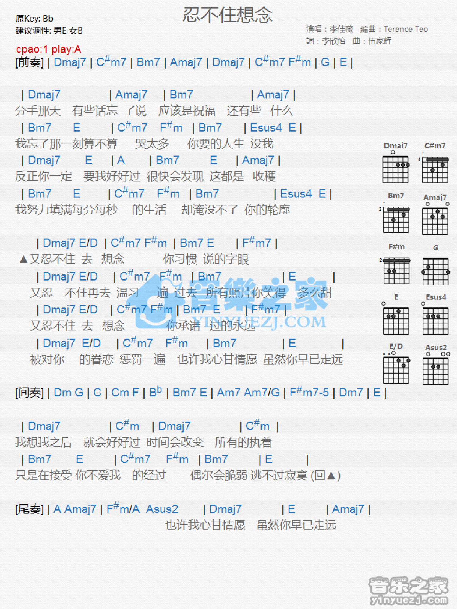 曲谱介绍: A调版李佳薇《忍不住想念》吉他和弦弹唱谱