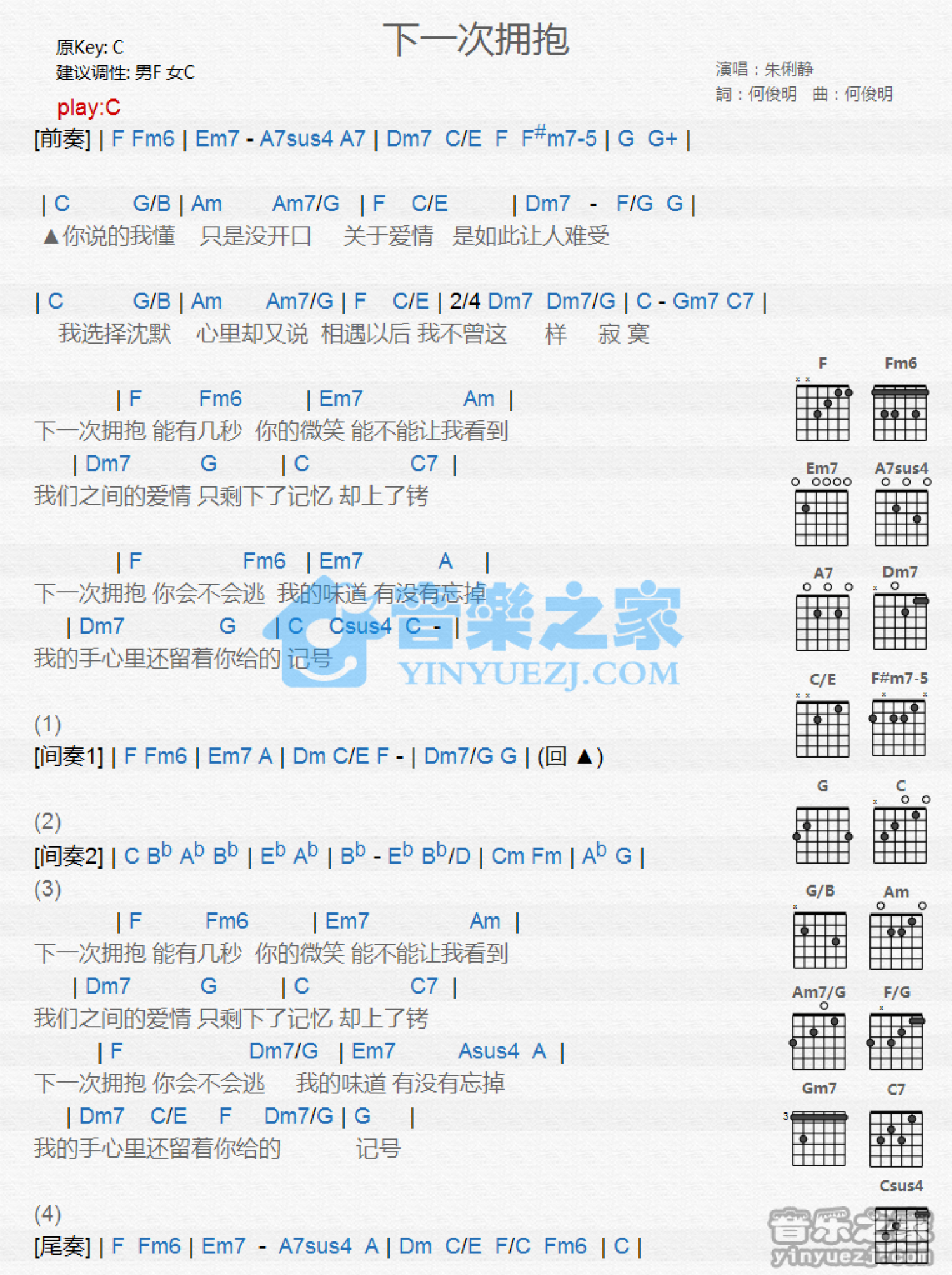 曲谱介绍: C调版朱俐静《下一次拥抱》吉他和弦弹唱谱
