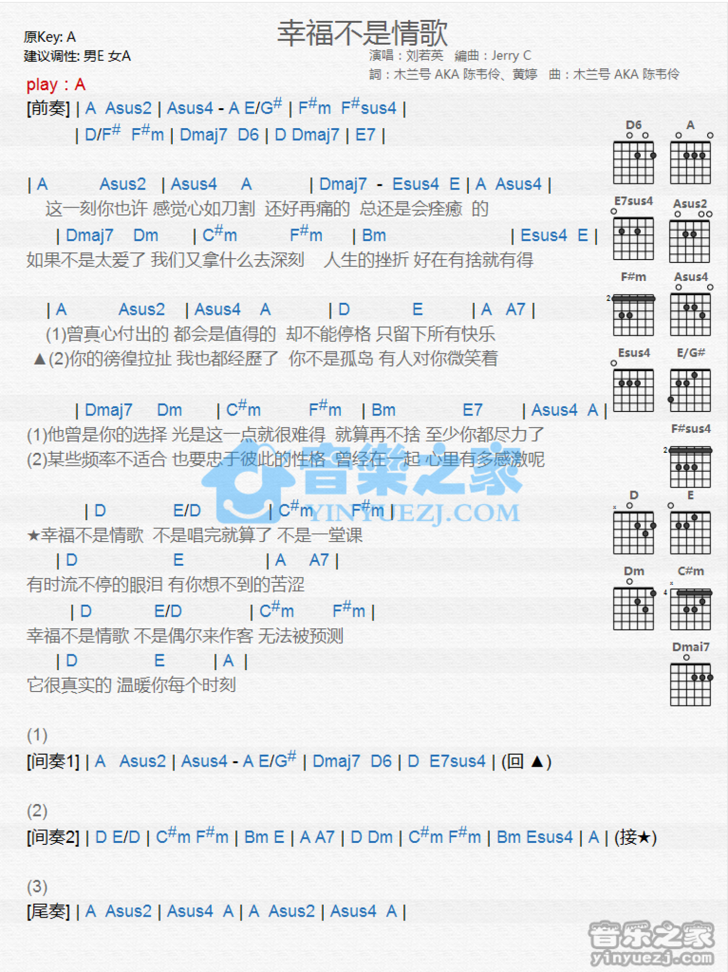 曲谱介绍: A调版 刘若英《幸福不是情歌》吉他和弦弹唱谱