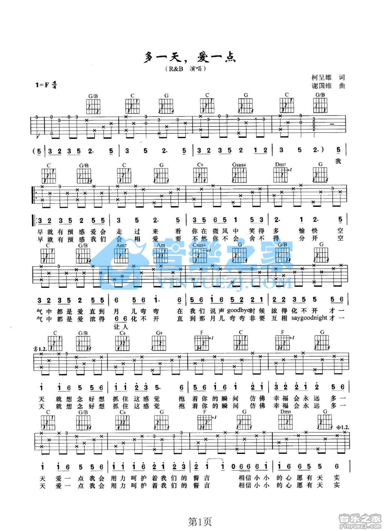 曲谱介绍: F调版R&B《多一天爱一点》吉他弹唱六线谱