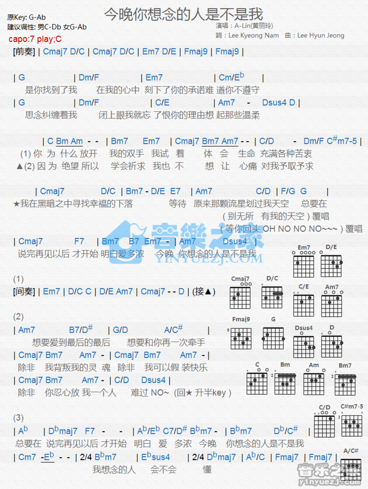曲谱介绍: C调版《今晚你想念的人是不是我》吉他和弦弹唱谱