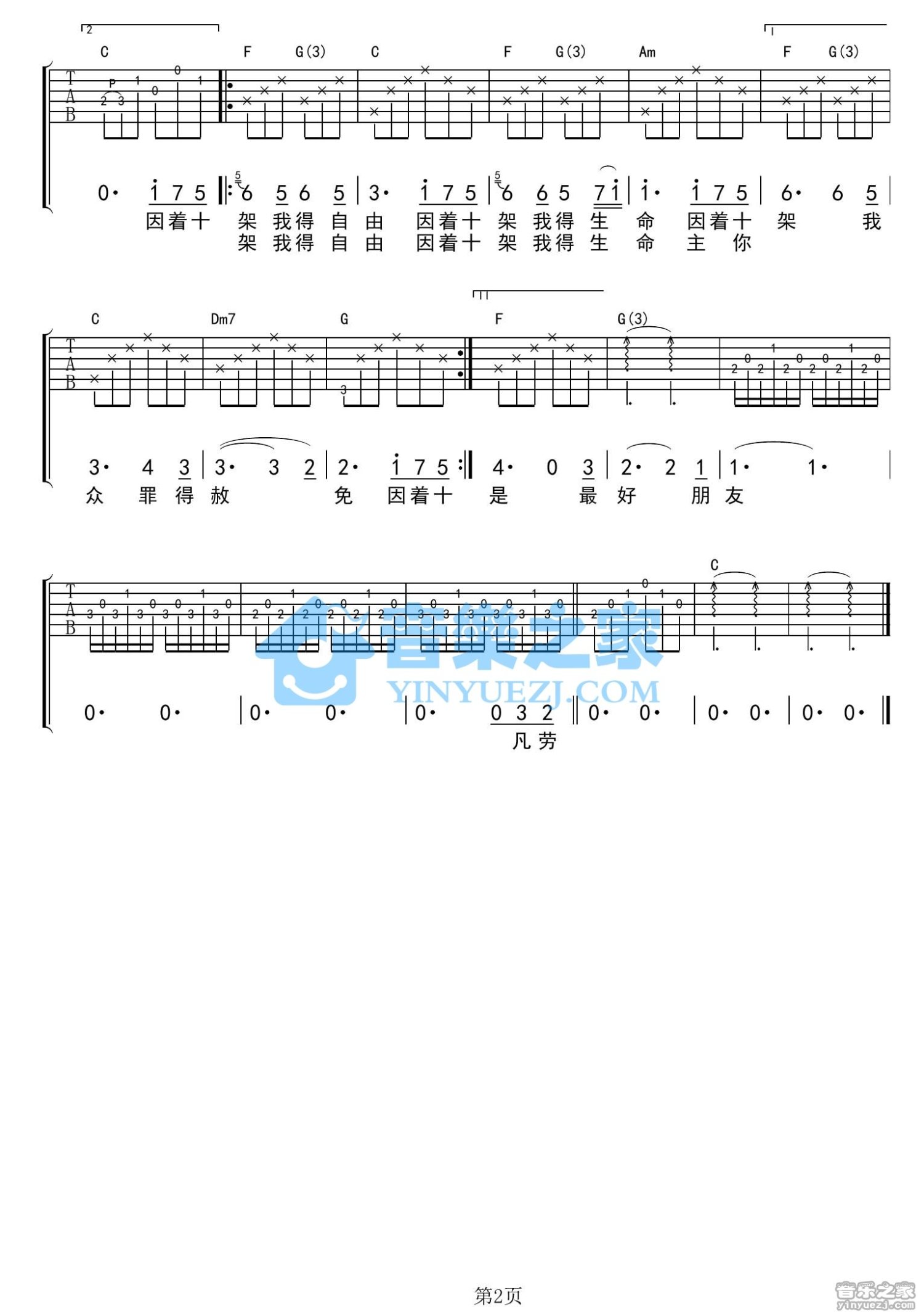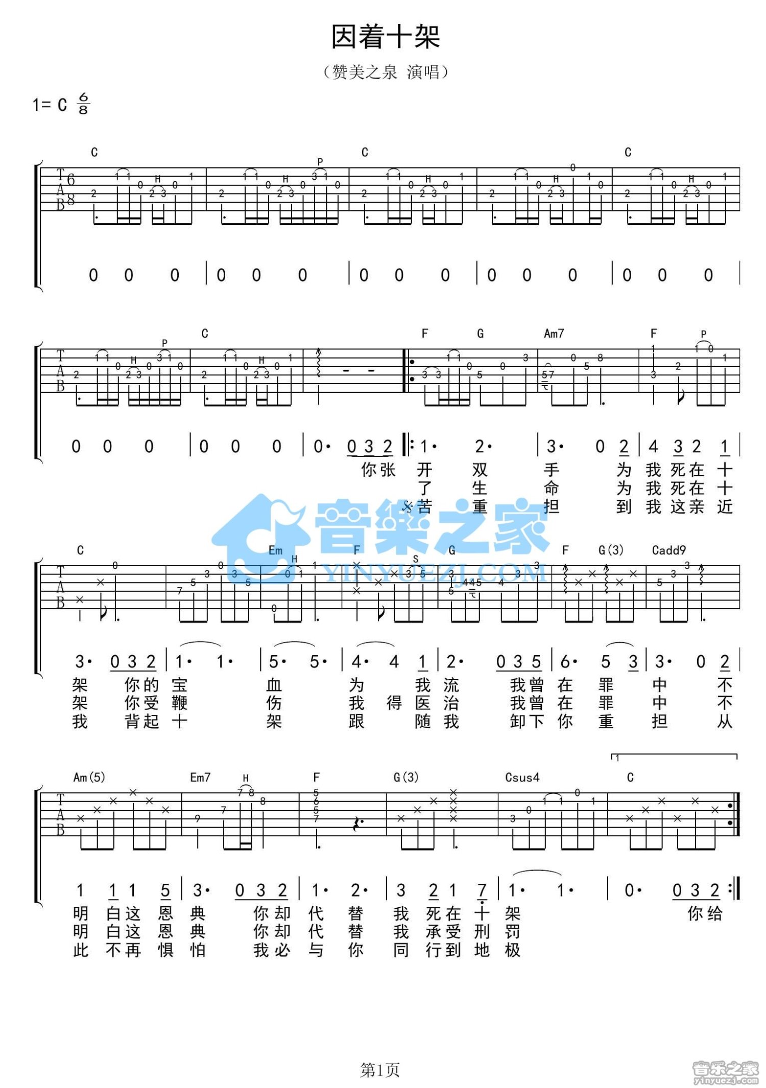 曲谱介绍: C调版《因着十架》吉他弹唱六线谱