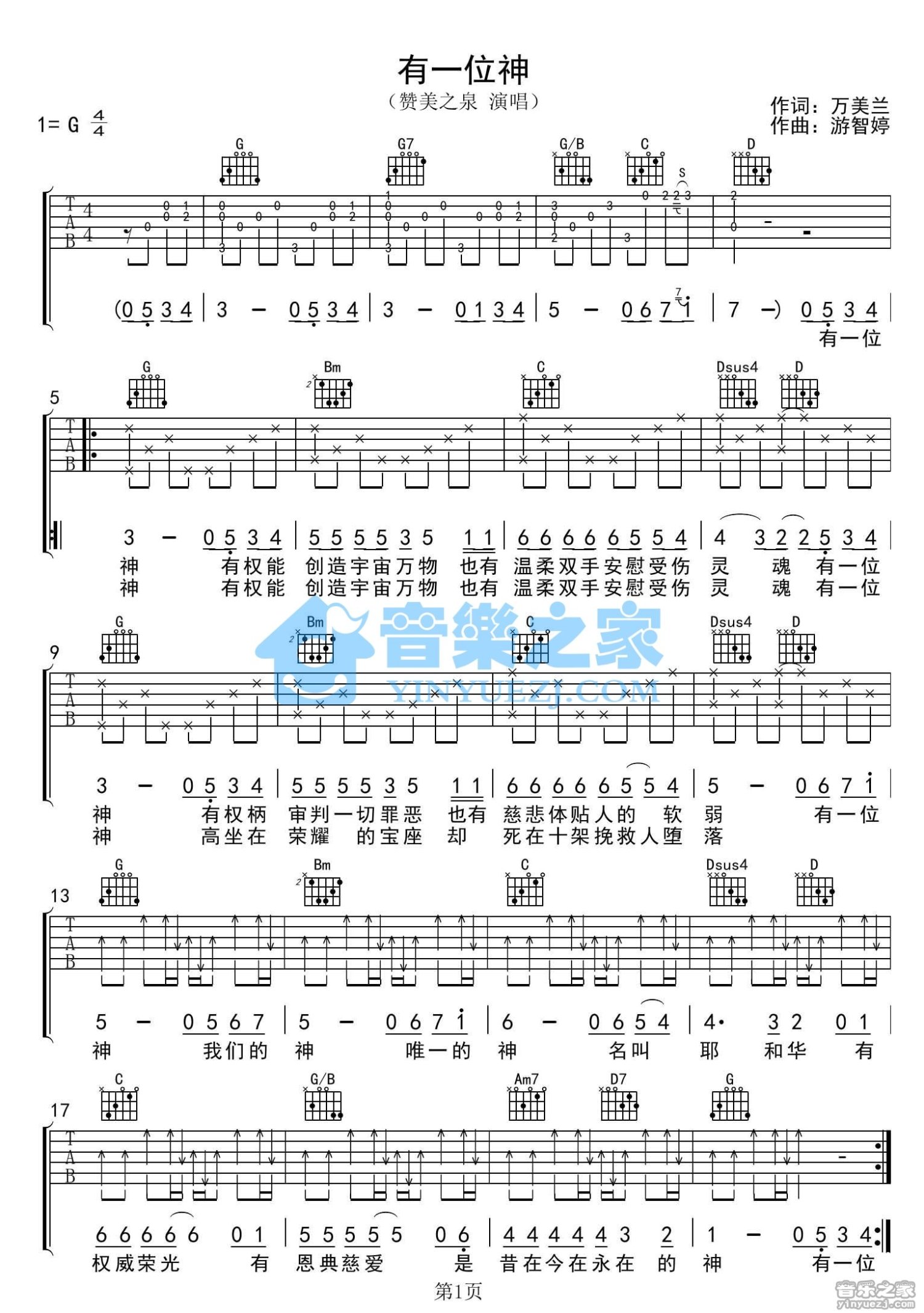 曲谱介绍: G调版《有一位神》吉他弹唱六线谱