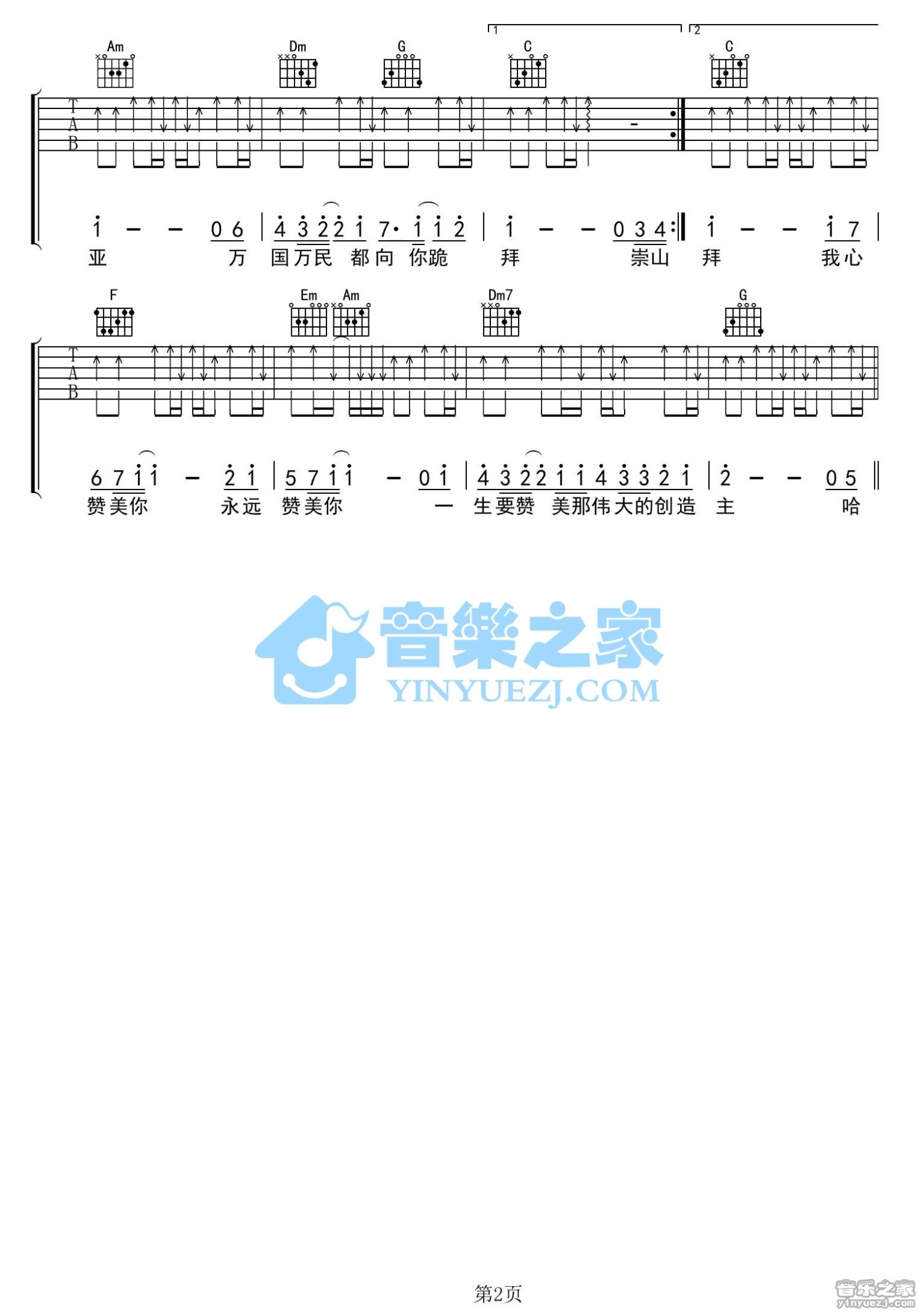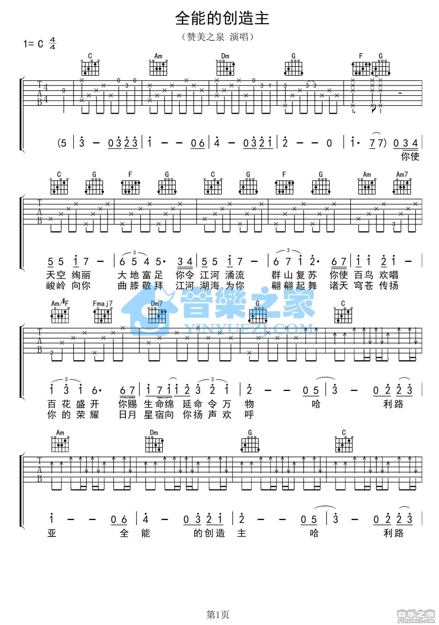 曲谱介绍: C调版《全能的创造主》吉他弹唱六线谱