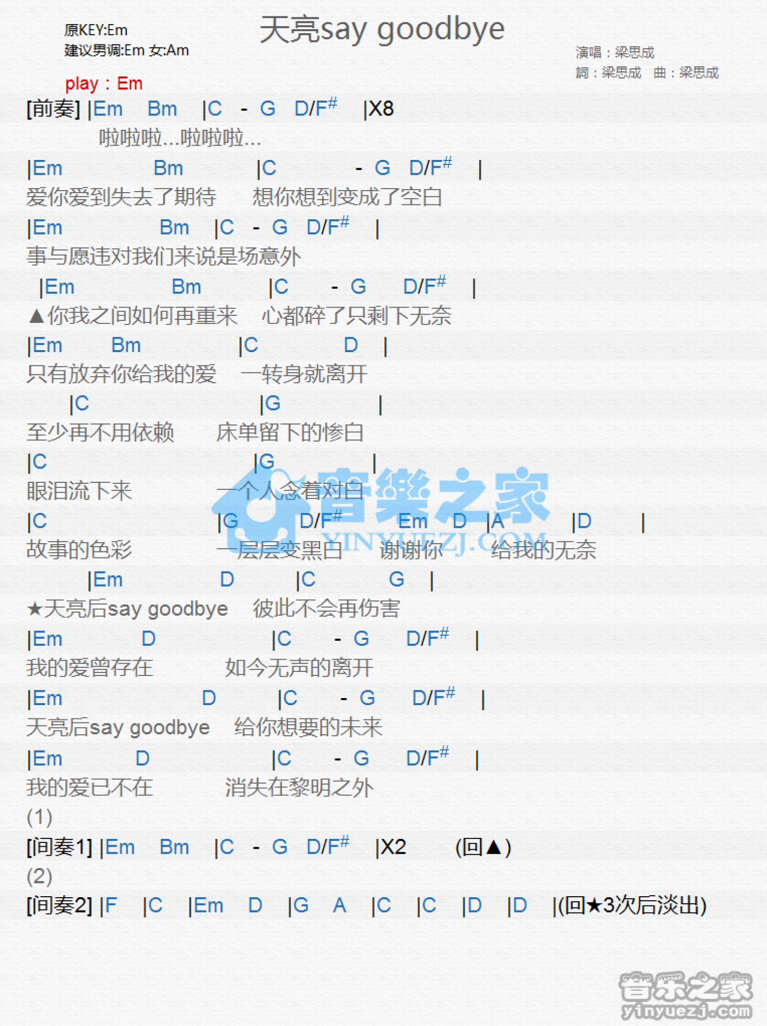 曲谱介绍: Em调版《天亮saygoodbye》吉他和弦弹唱谱