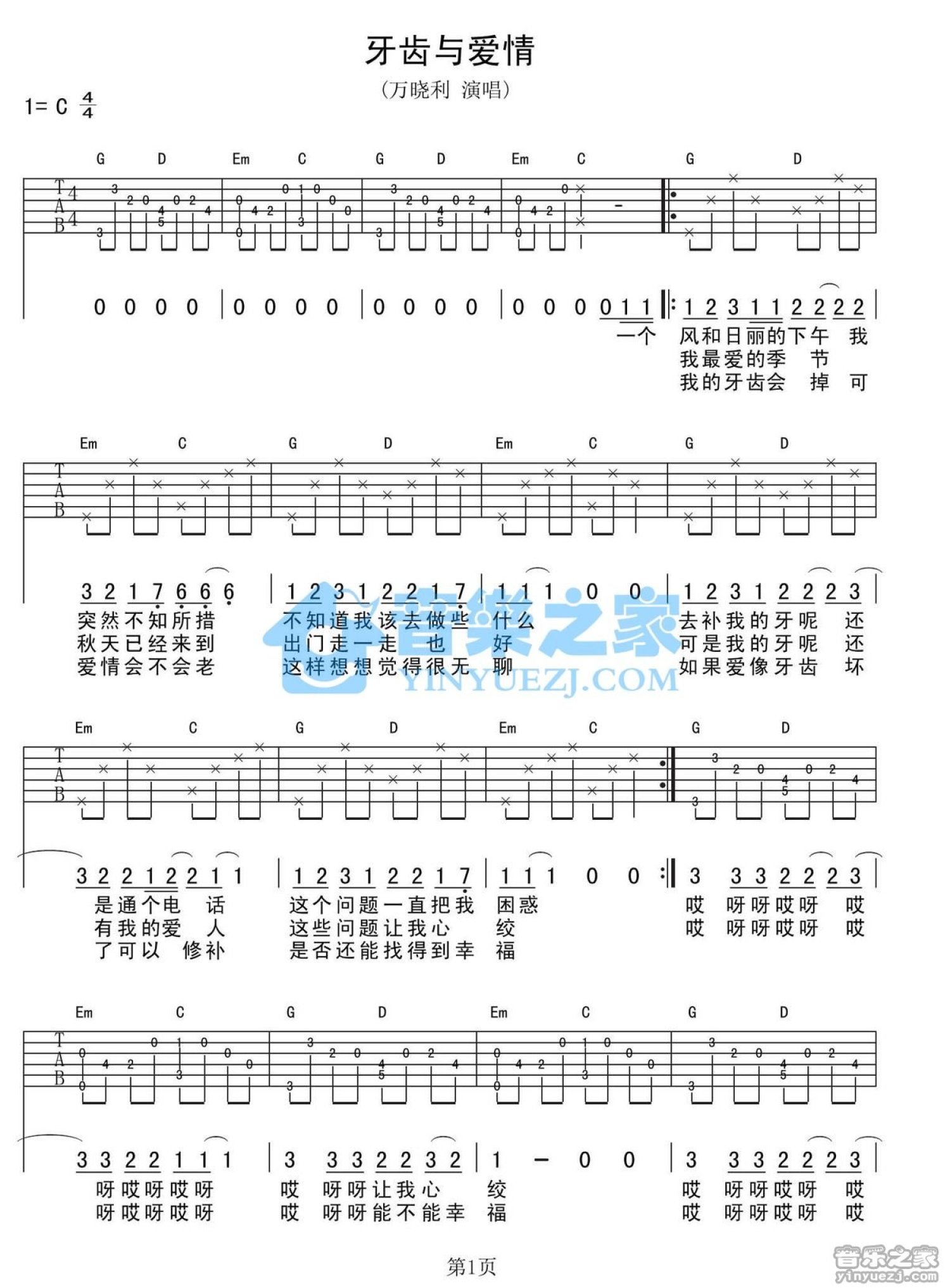牙齿与爱情吉他谱 - 万晓利 - C调吉他弹唱谱