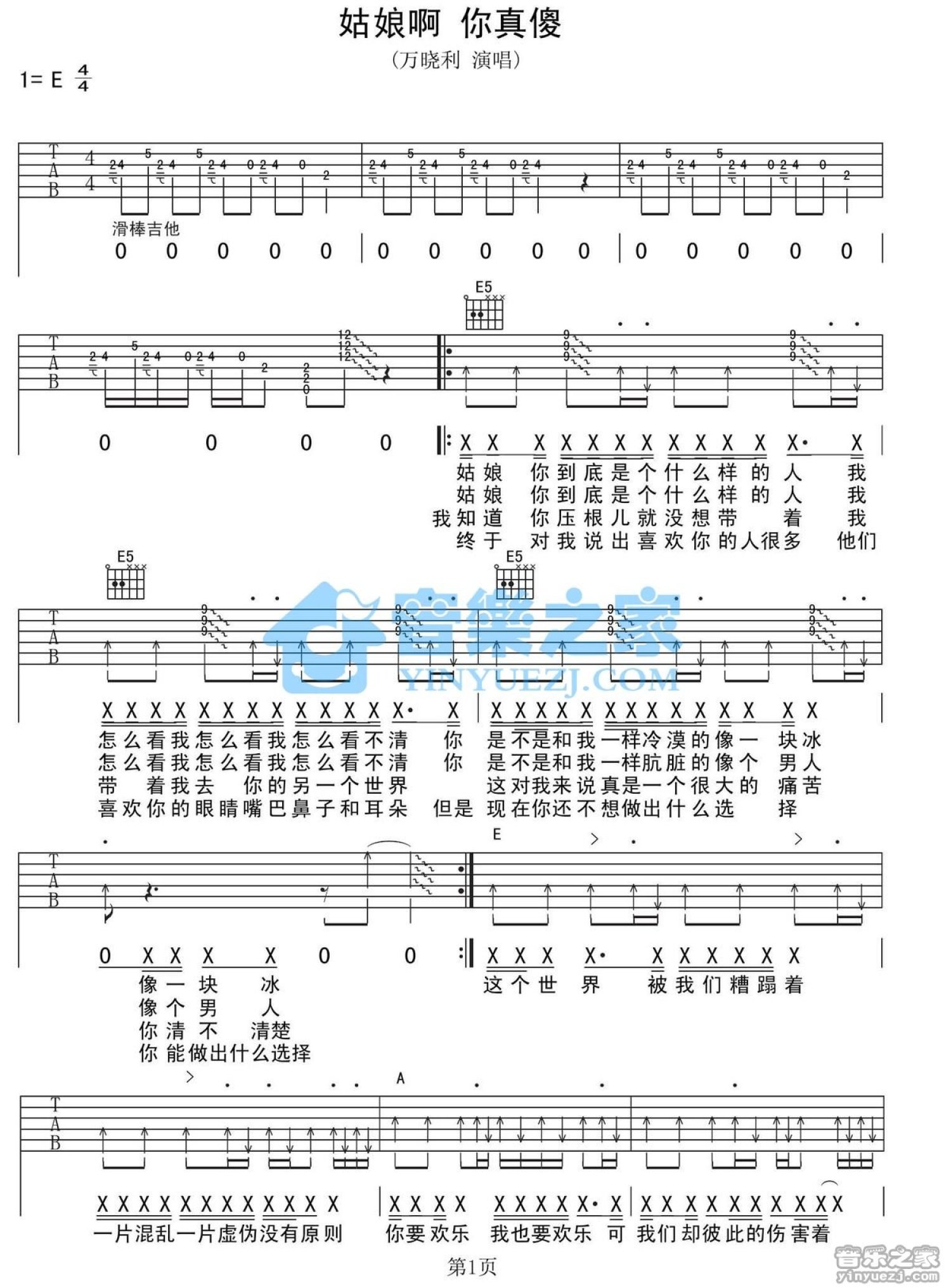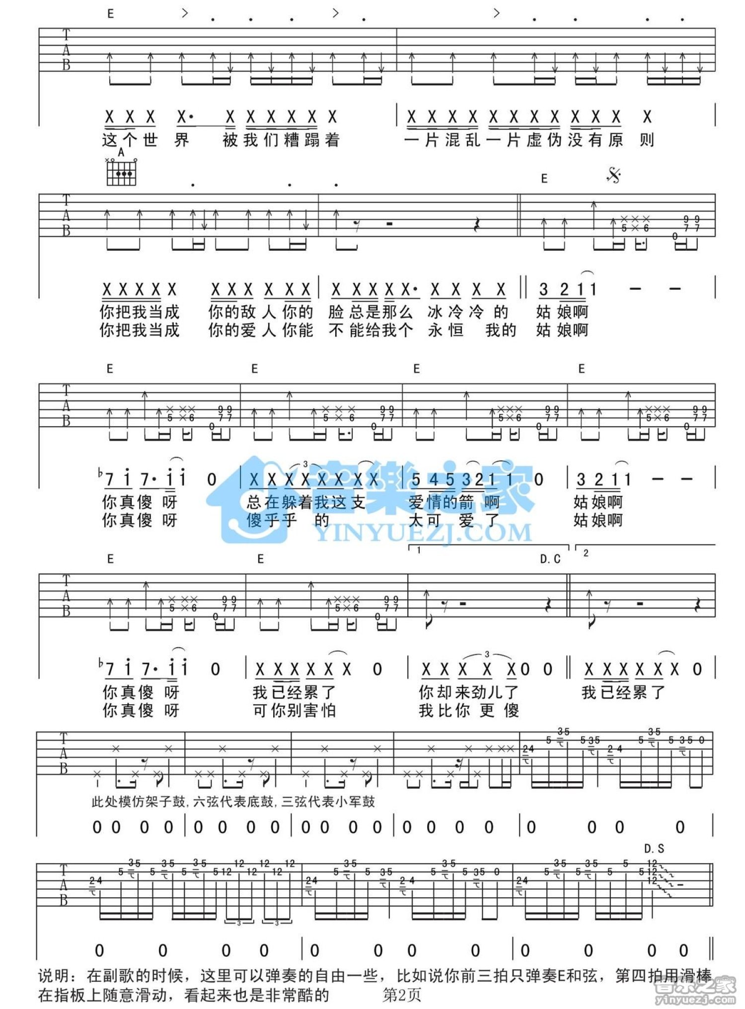 曲谱介绍: E调版《姑娘啊你真傻》吉他弹唱六线谱