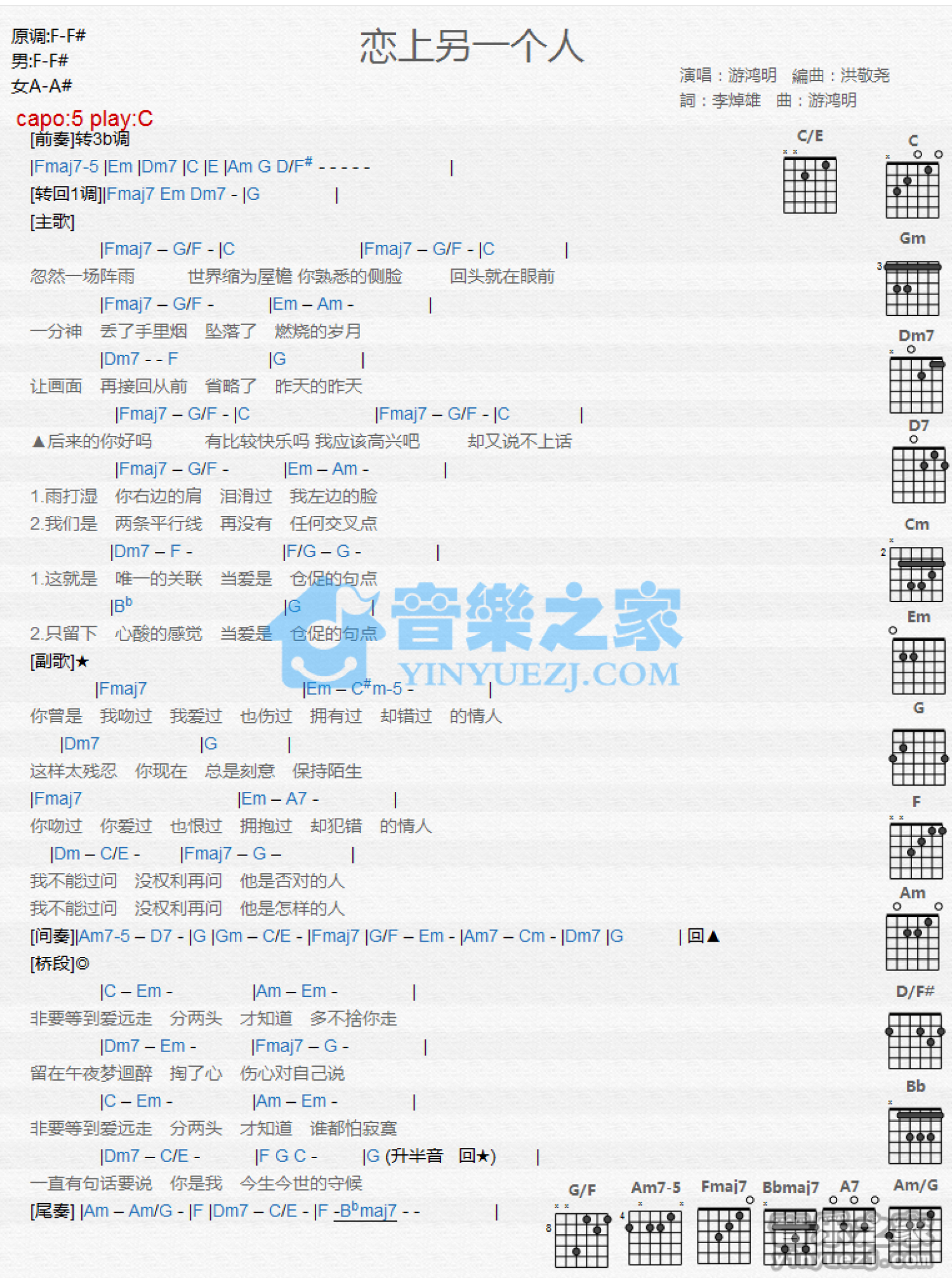 曲谱介绍: C调版《恋上另一个人》吉他和弦弹唱谱
