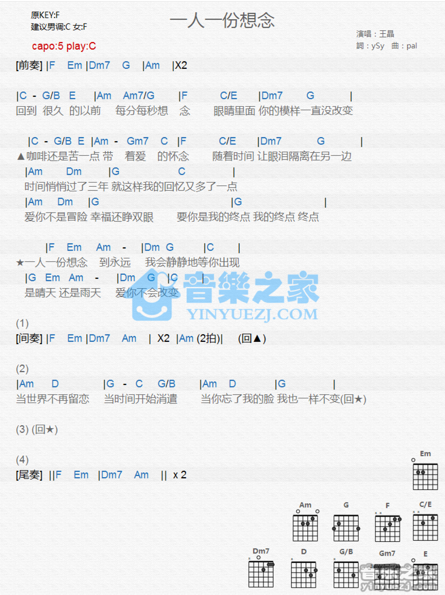 曲谱介绍: C调版《一人一份想念》吉他和弦弹唱谱