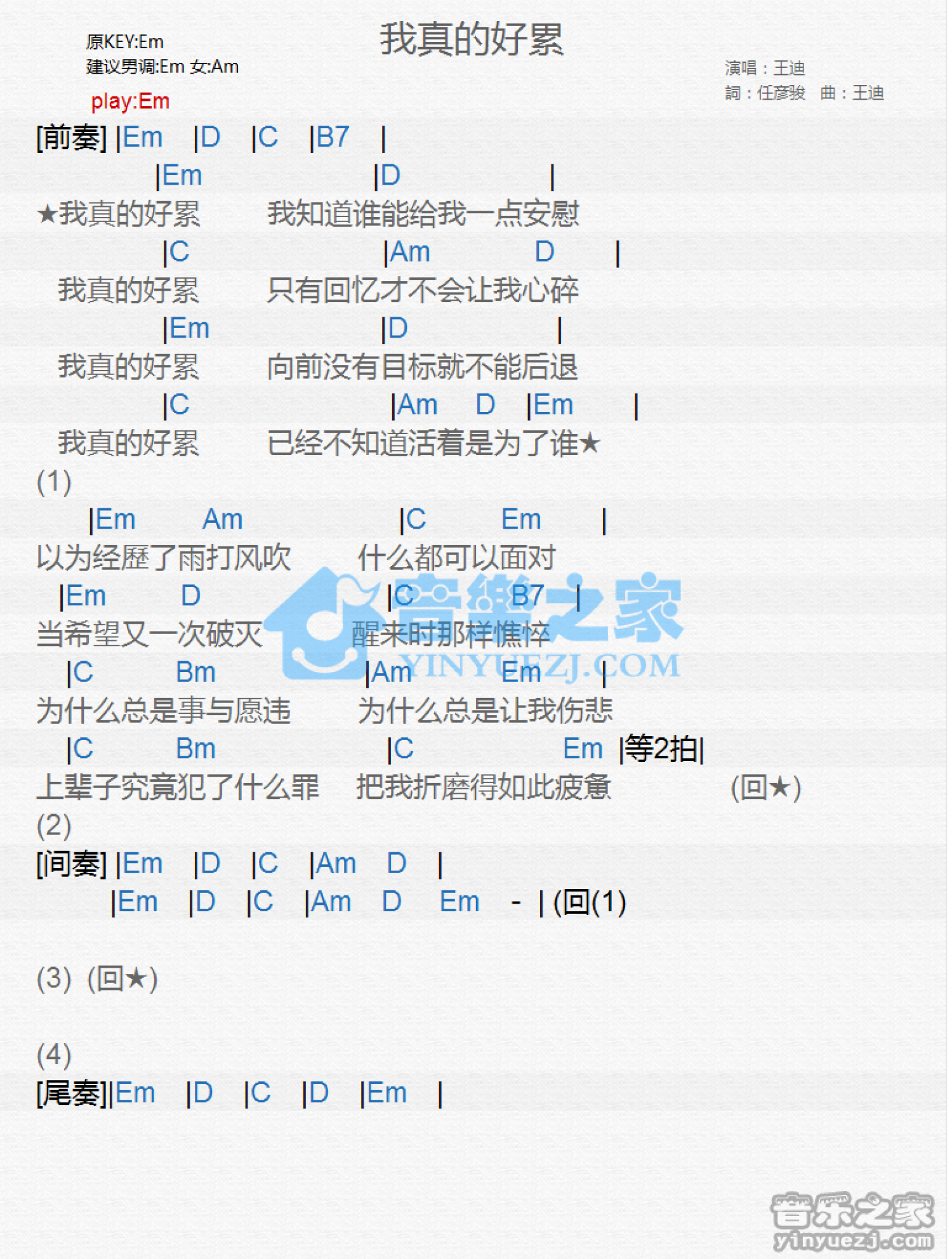 曲谱介绍: Em调版《我真的好累》吉他和弦弹唱谱