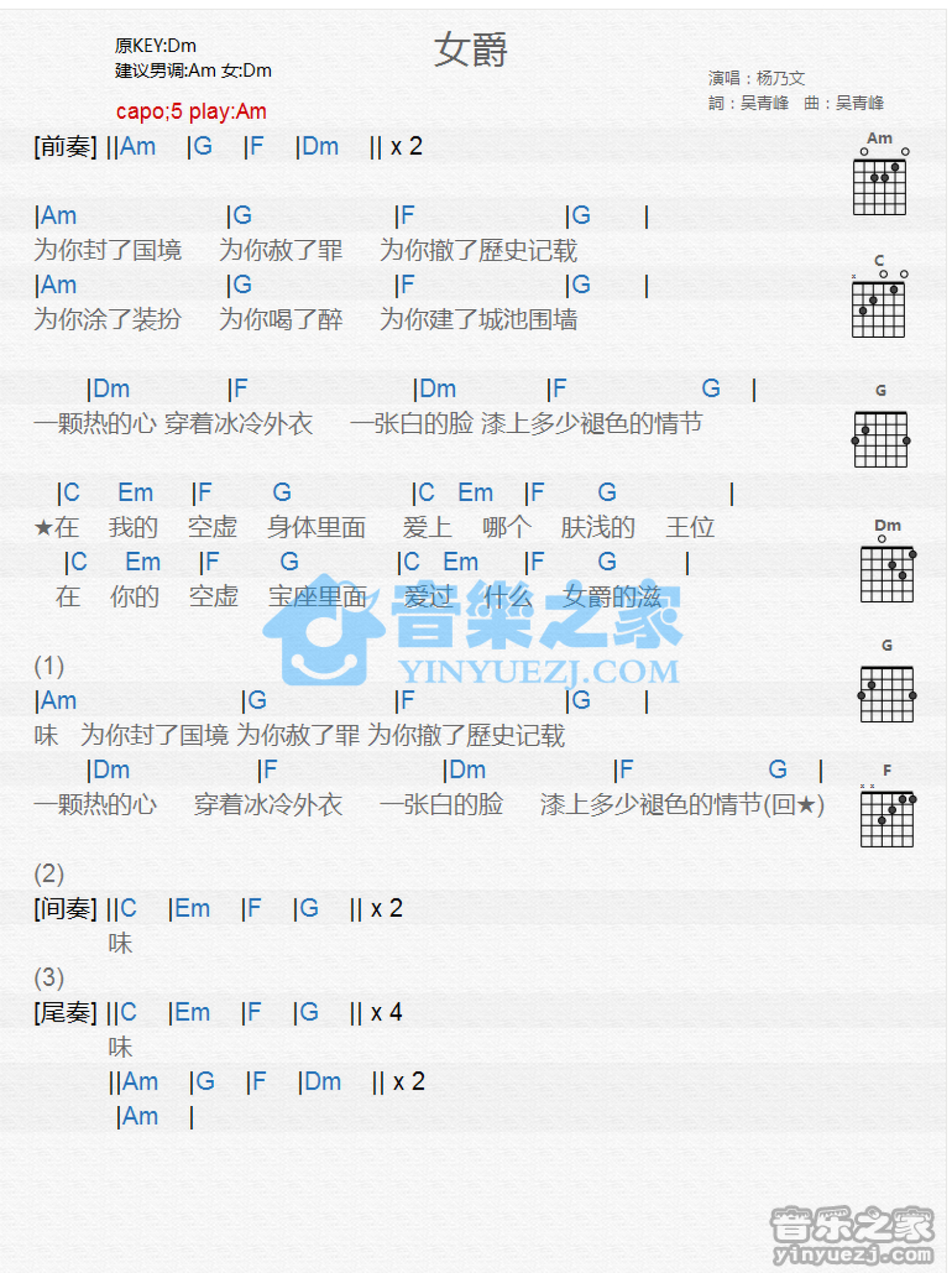 曲谱介绍: Am调版《女爵》吉他和弦弹唱谱
