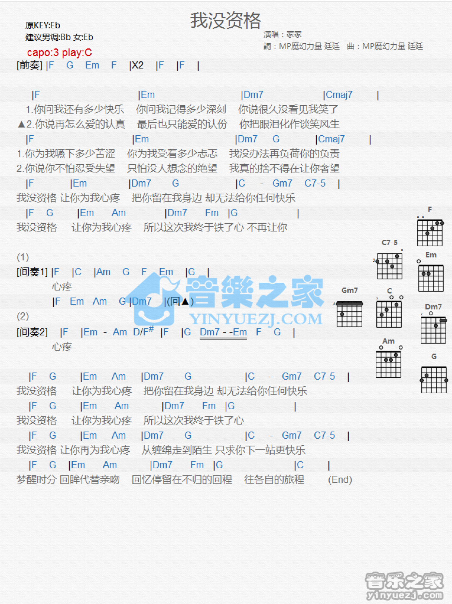 我没资格吉他谱 - 家家 - C调吉他弹唱谱 - 和弦谱