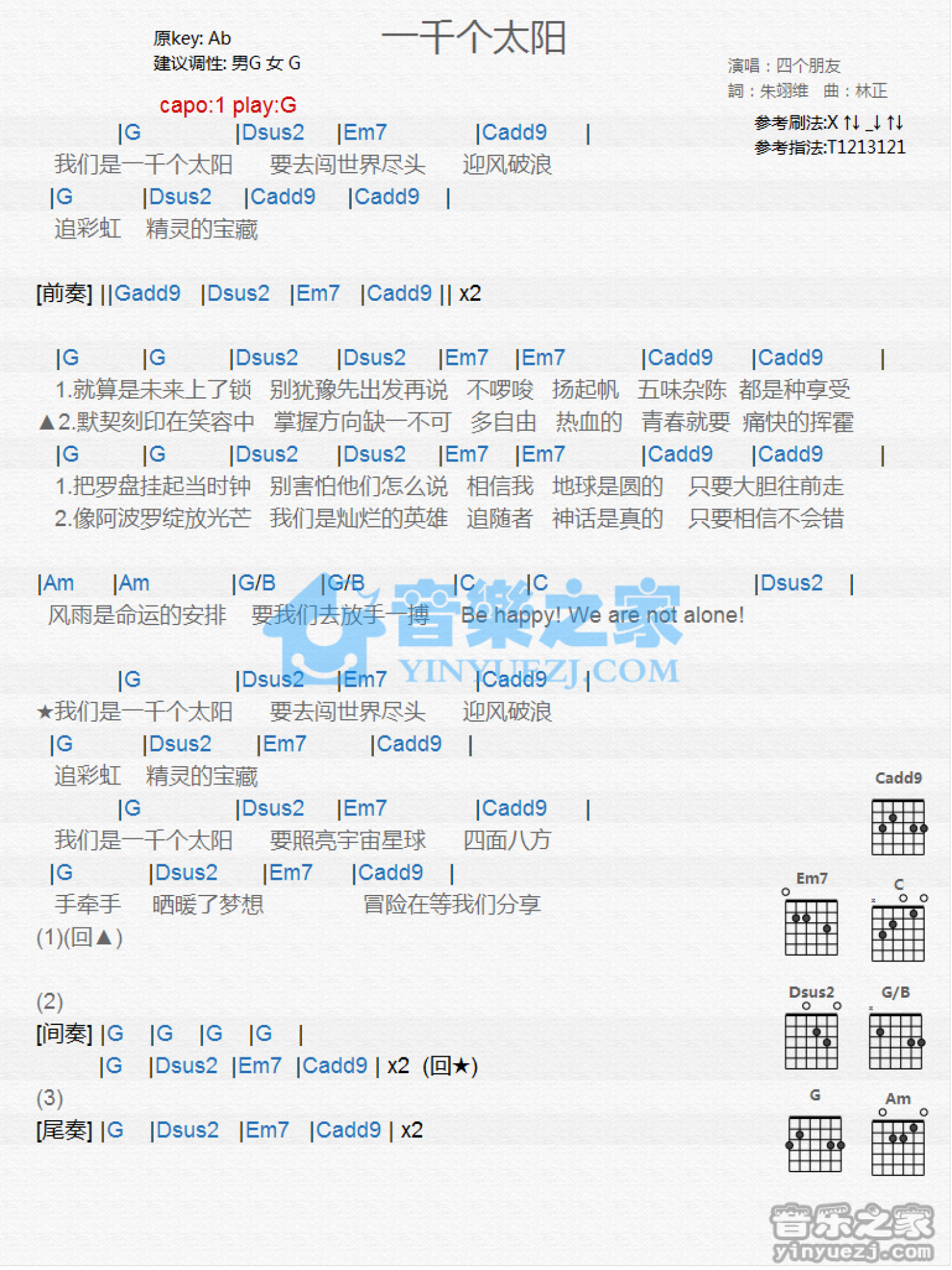 一千个太阳吉他谱 - 四个朋友 - G调吉他弹唱谱 - 和弦谱