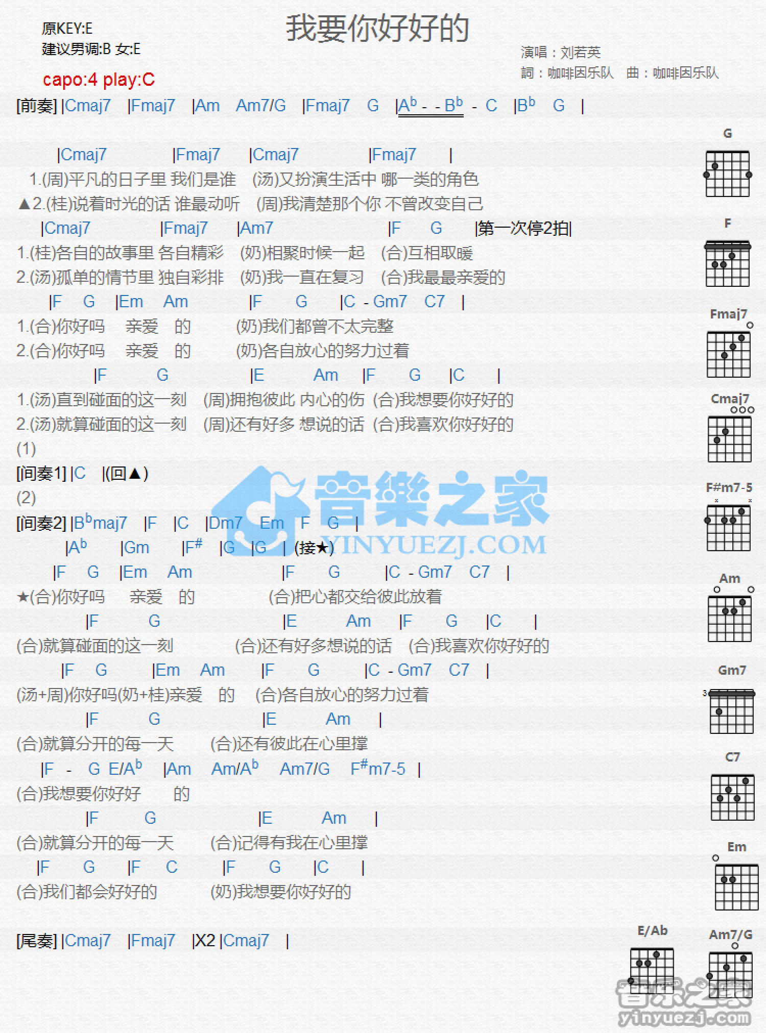 曲谱介绍: C调版《我要你好好的》吉他和弦弹唱谱
