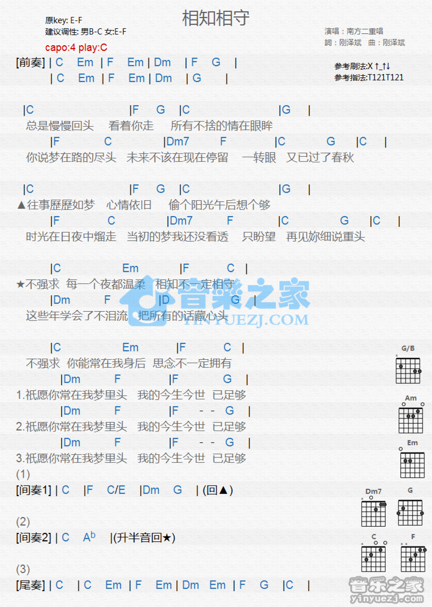 曲谱介绍: C调版《相知相守》吉他和弦弹唱谱