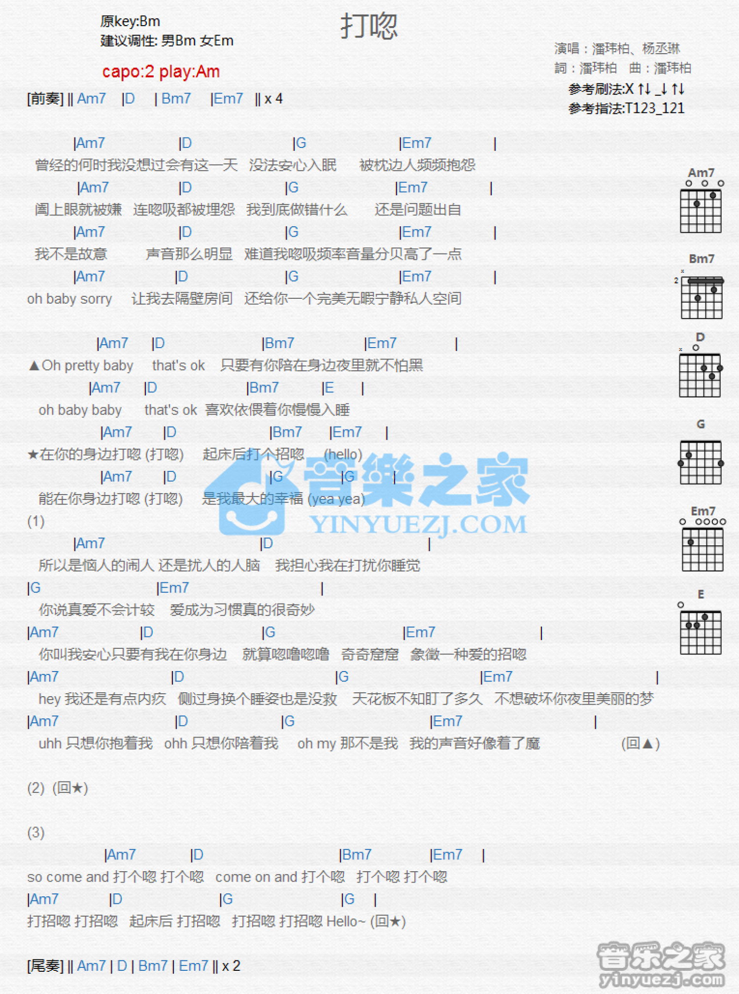 曲谱介绍: Am调版《打呼》吉他和弦弹唱谱