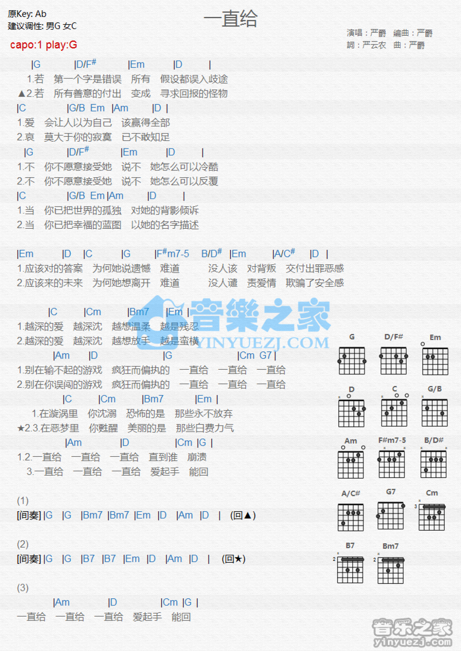 一直给吉他谱 - 严爵 - G调吉他弹唱谱 - 和弦谱