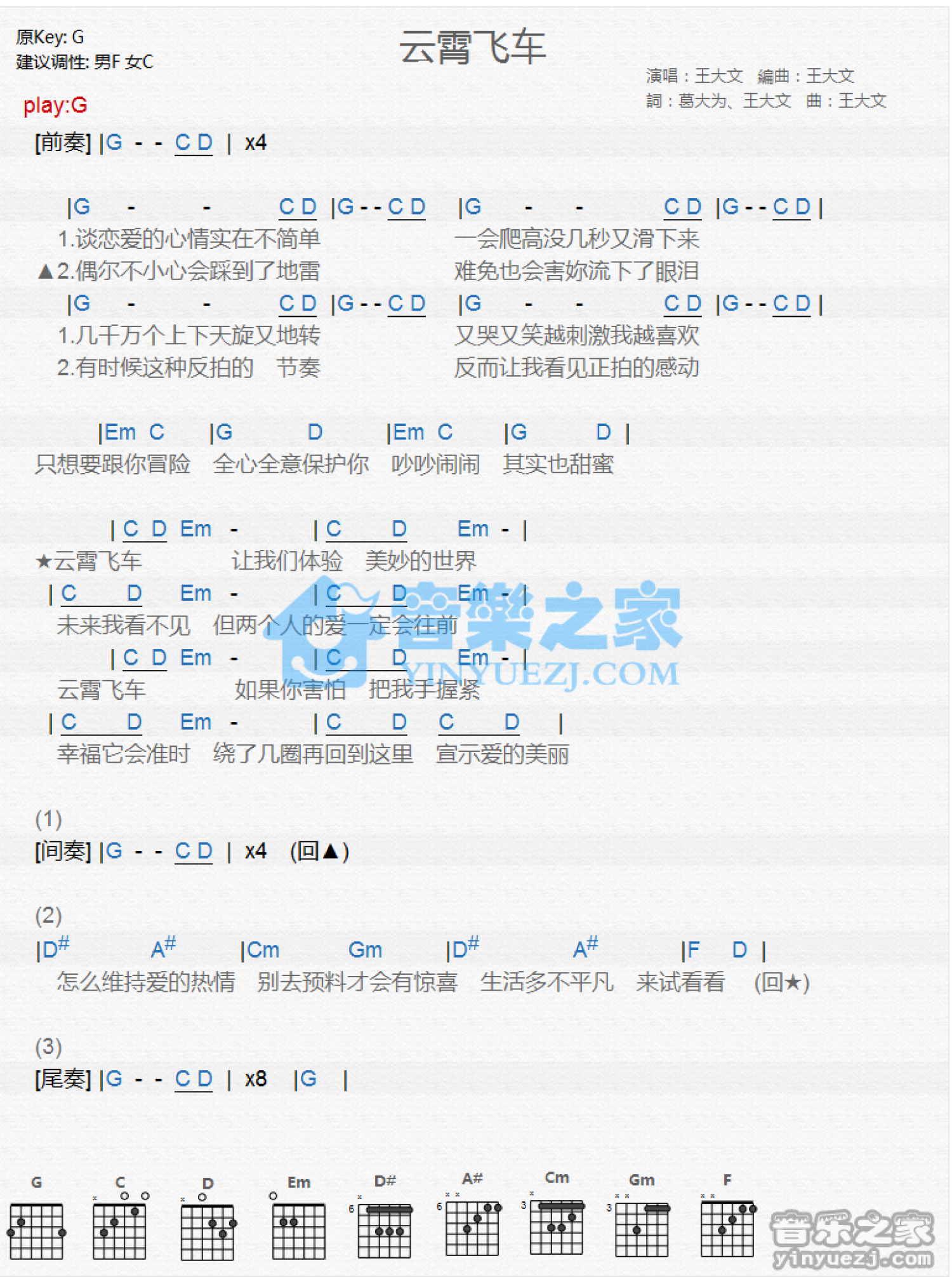 曲谱介绍: G调版《云霄飞车》吉他和弦弹唱谱