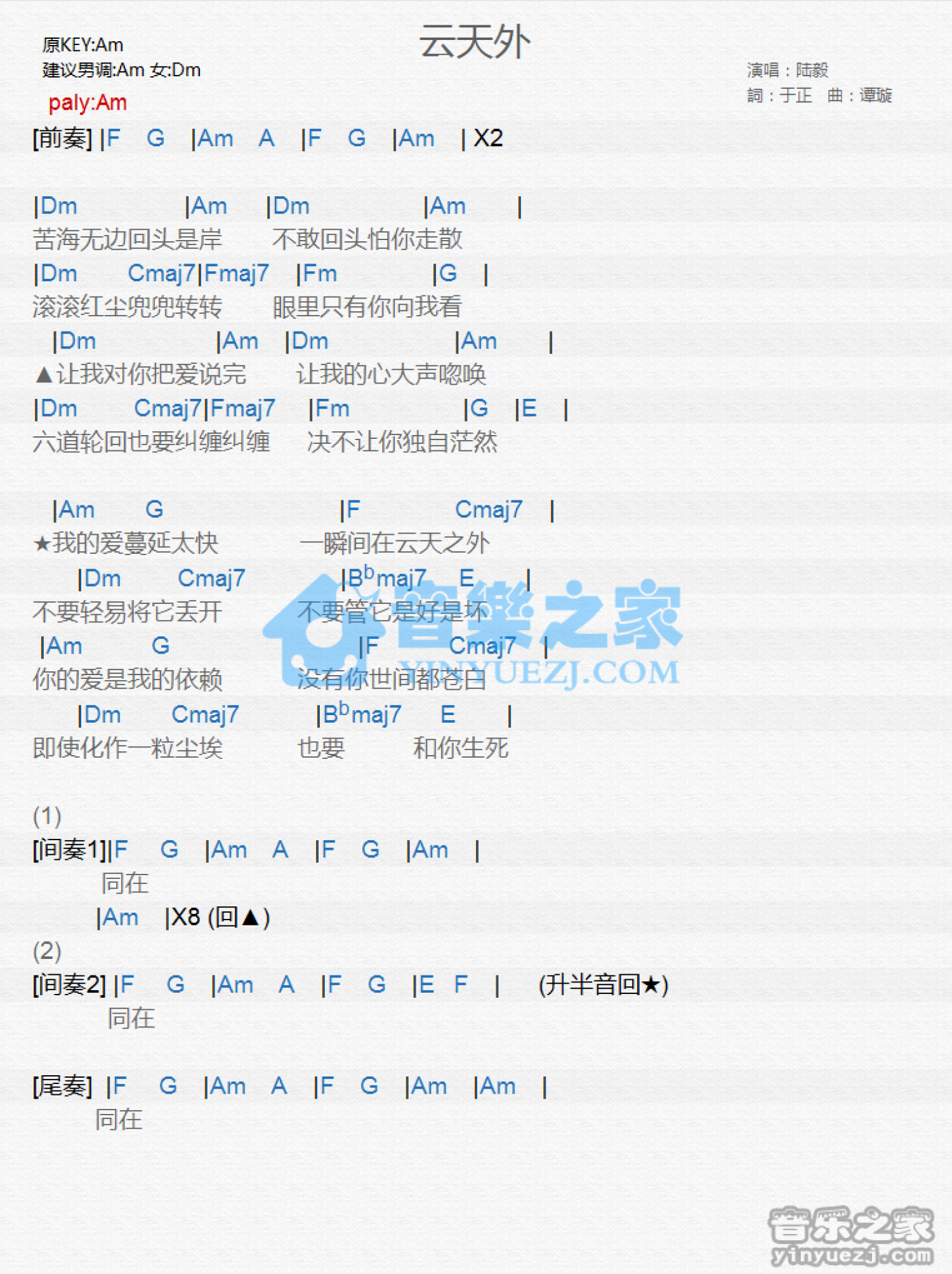曲谱介绍: Am调版《云天外》吉他和弦弹唱谱