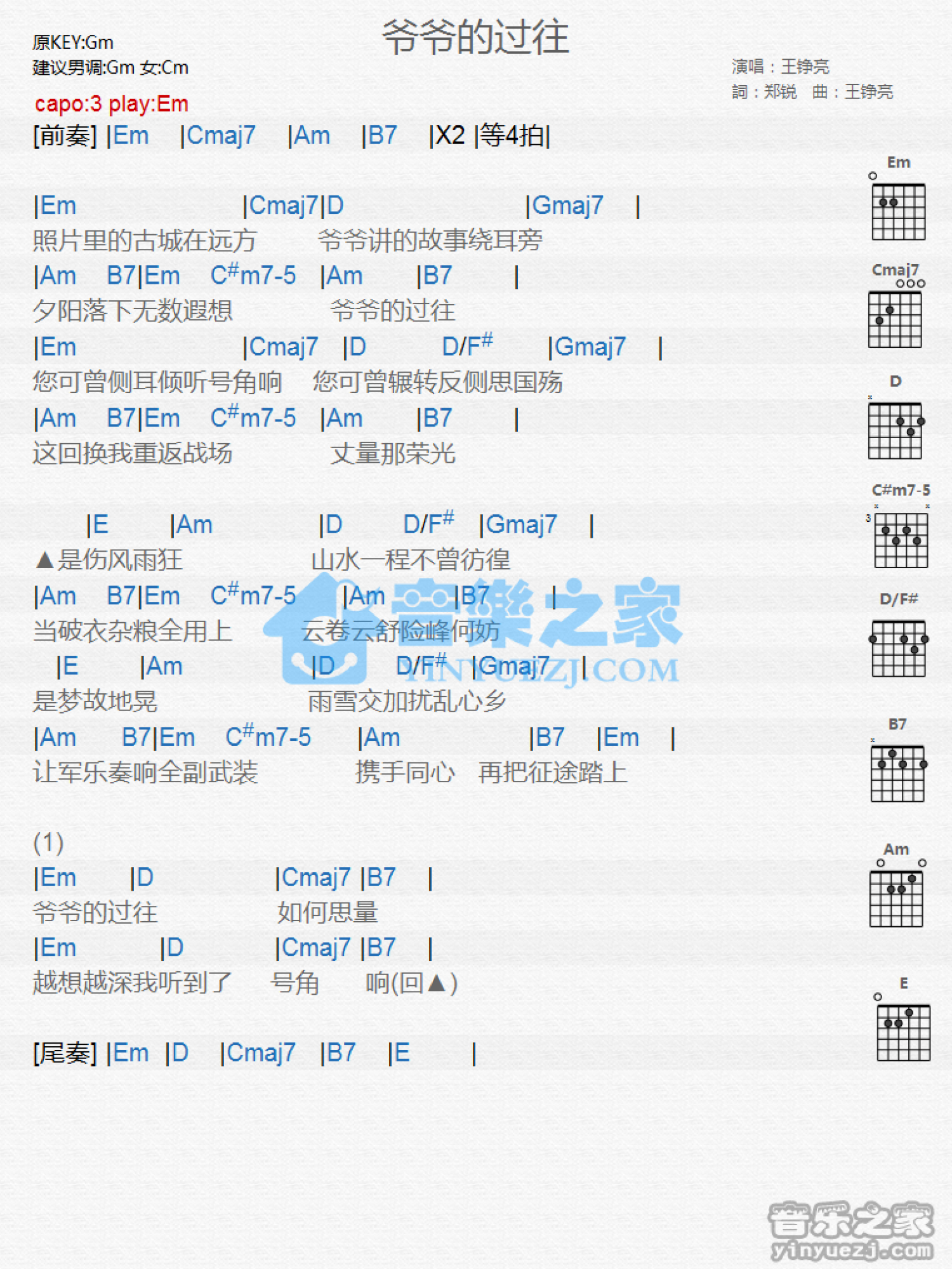 曲谱介绍: Em调版《爷爷的过往》吉他和弦弹唱谱