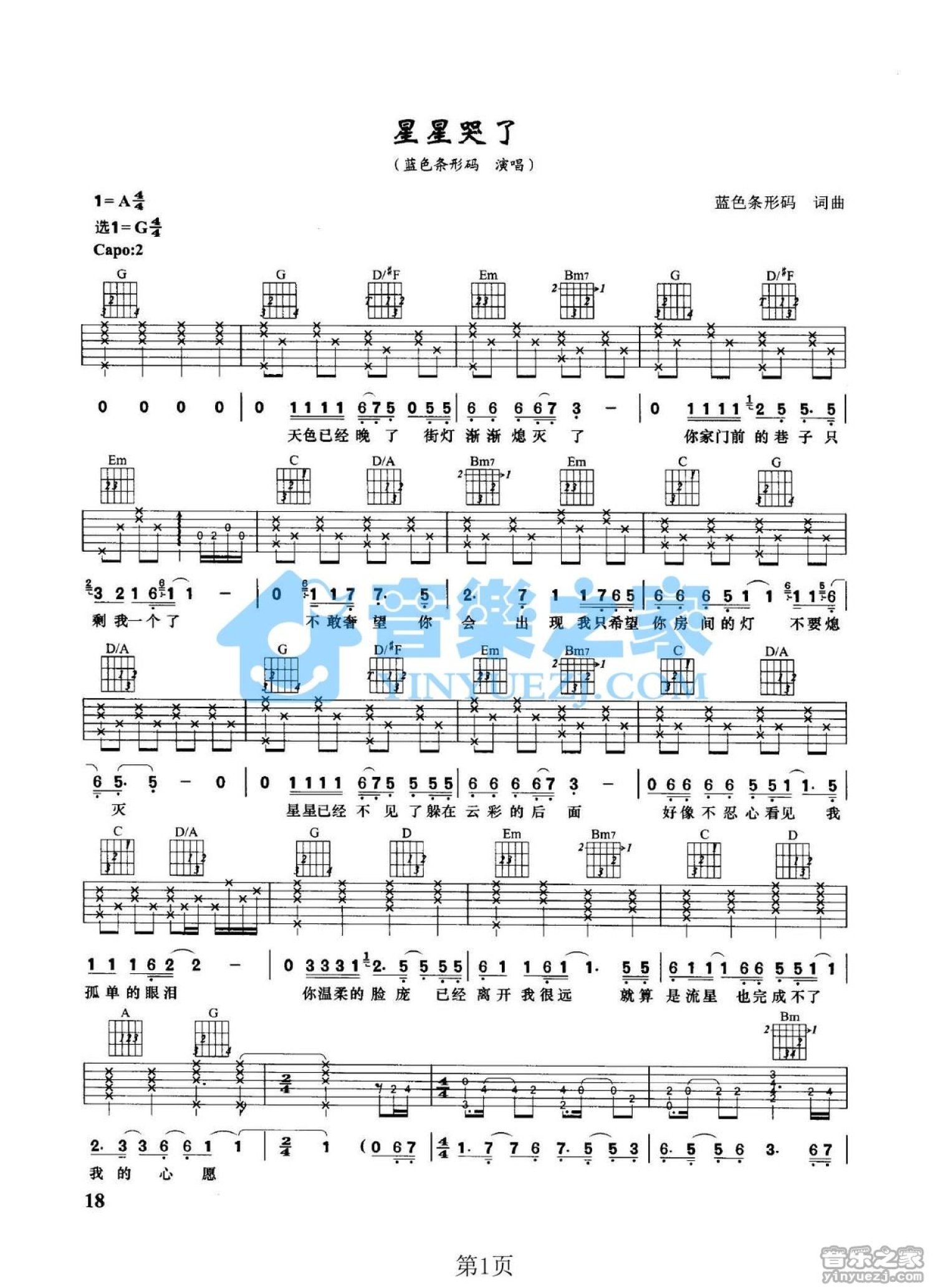 星星哭了吉他谱 - 蓝色条形码 - G调吉他弹唱谱