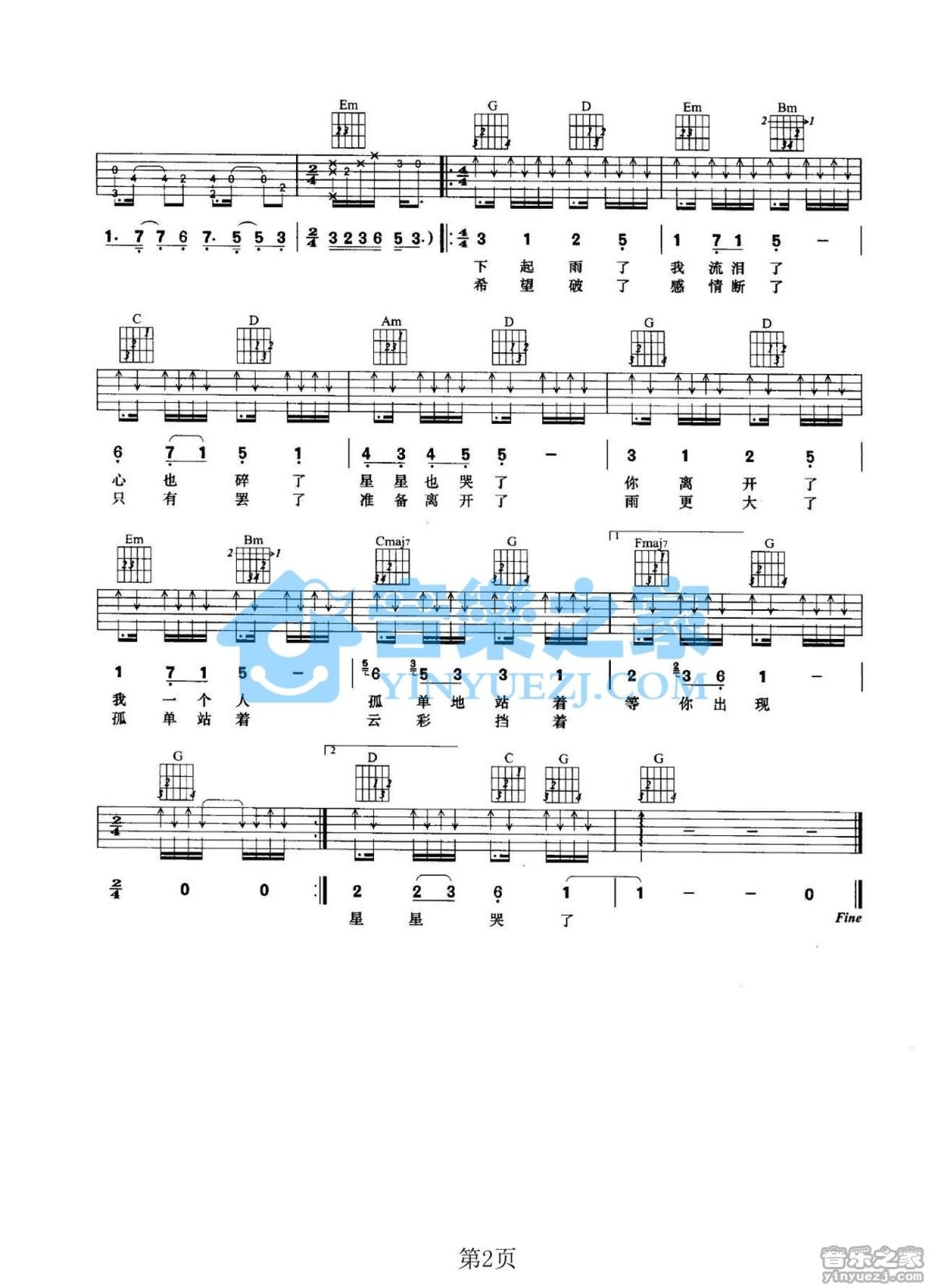 曲谱介绍: G调版《星星哭了》吉他弹唱六线谱