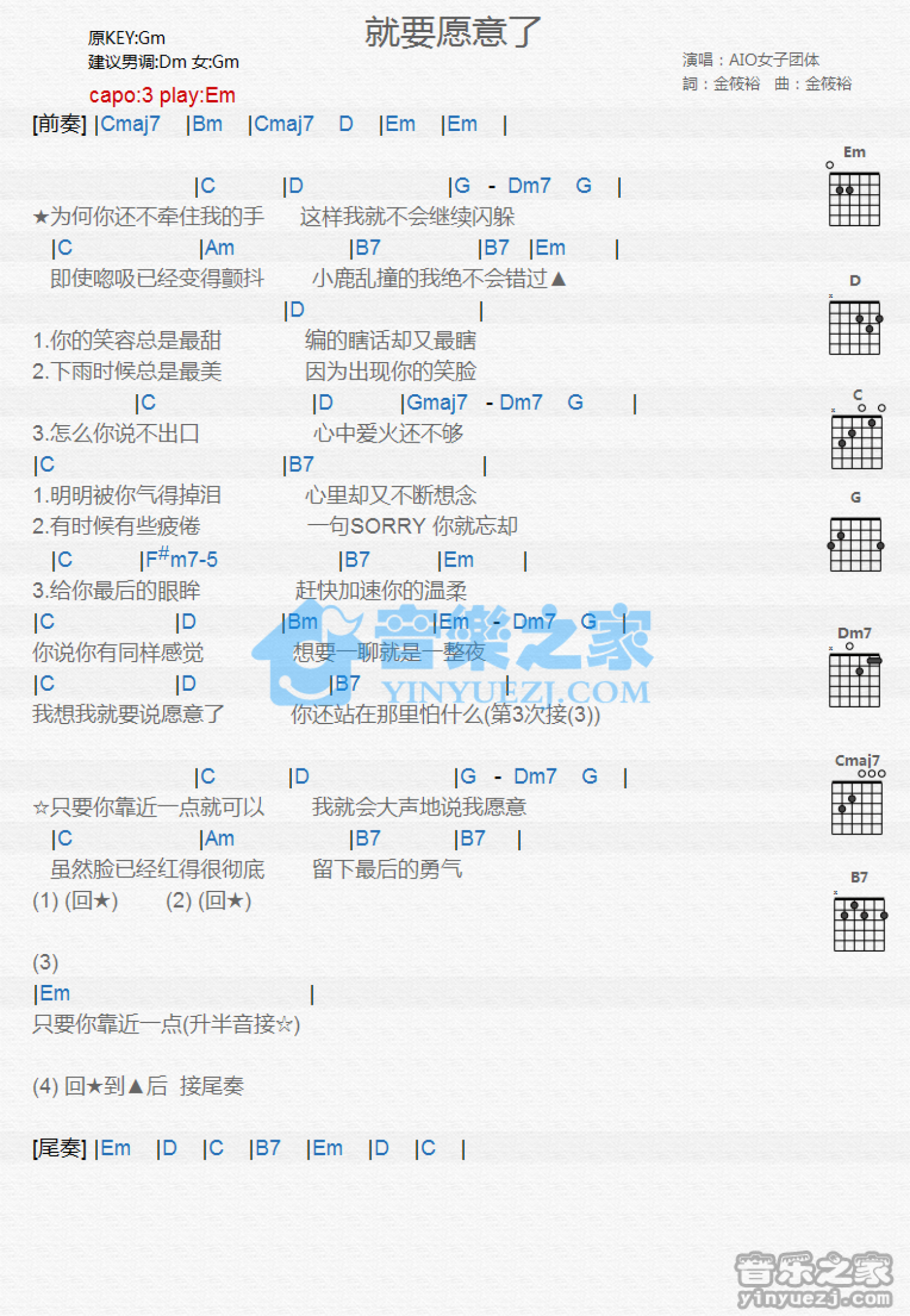 曲谱介绍: Em调版《就要愿意了》吉他和弦弹唱谱