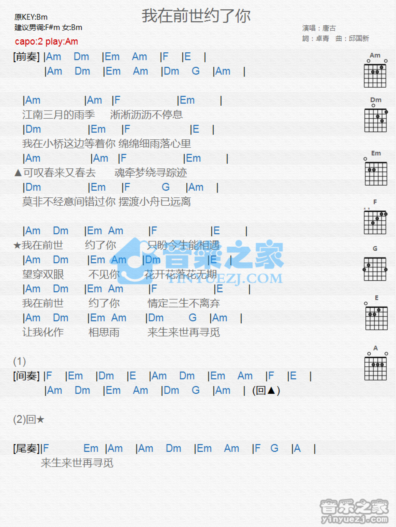 曲谱介绍: Am调版《我在前世约了你》吉他和弦弹唱谱