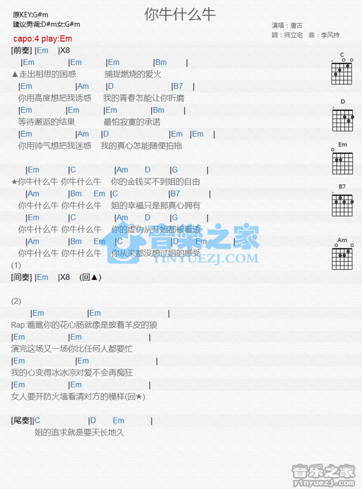 曲谱介绍: Em调版《你牛什么牛》吉他和弦弹唱谱