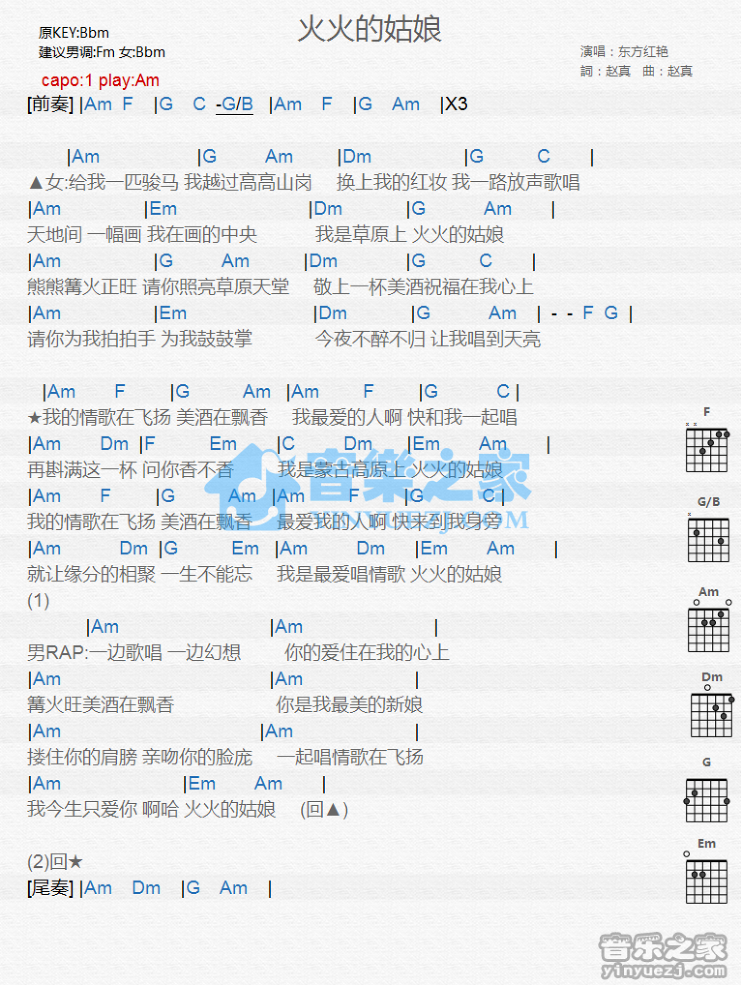 曲谱介绍: Am调版《火火的姑娘》吉他和弦弹唱谱