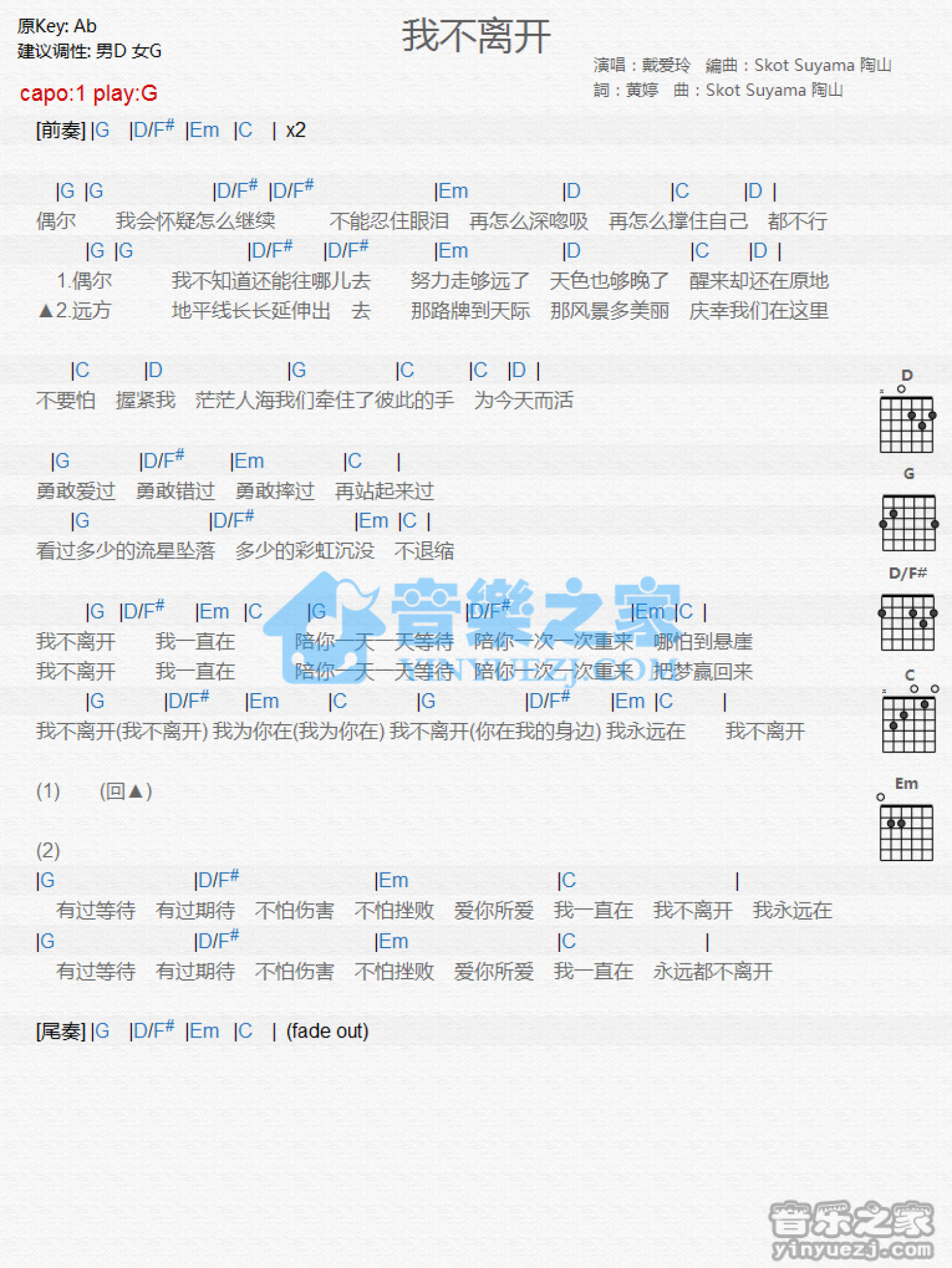 曲谱介绍: G调版《我不离开》吉他和弦弹唱谱
