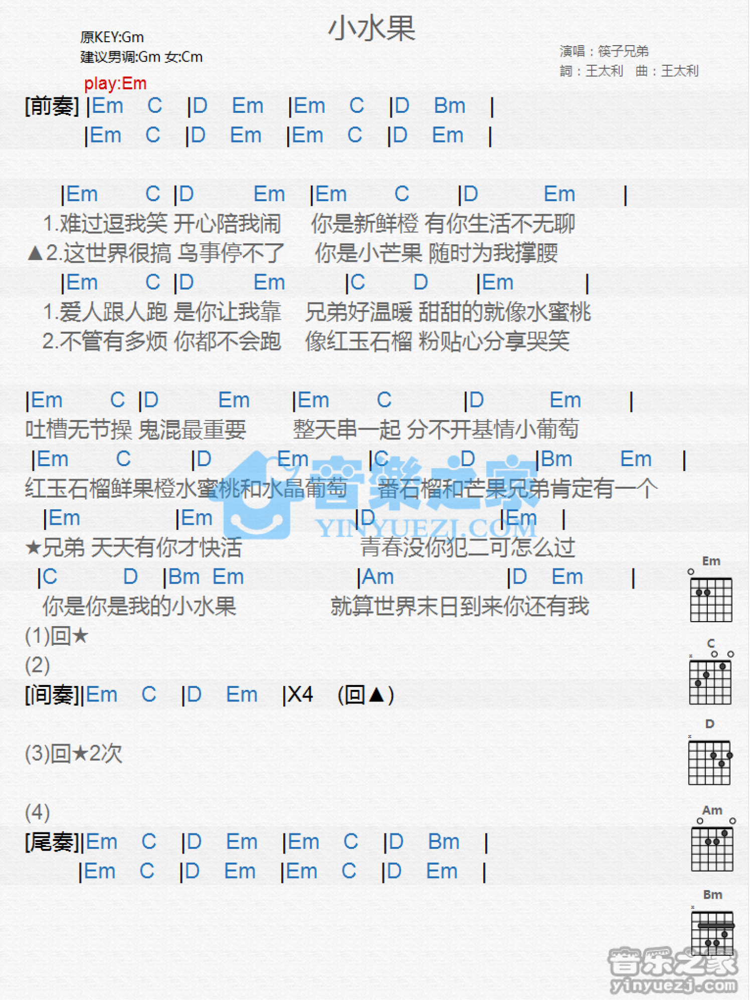 曲谱介绍: Em调版《小水果》吉他和弦弹唱谱
