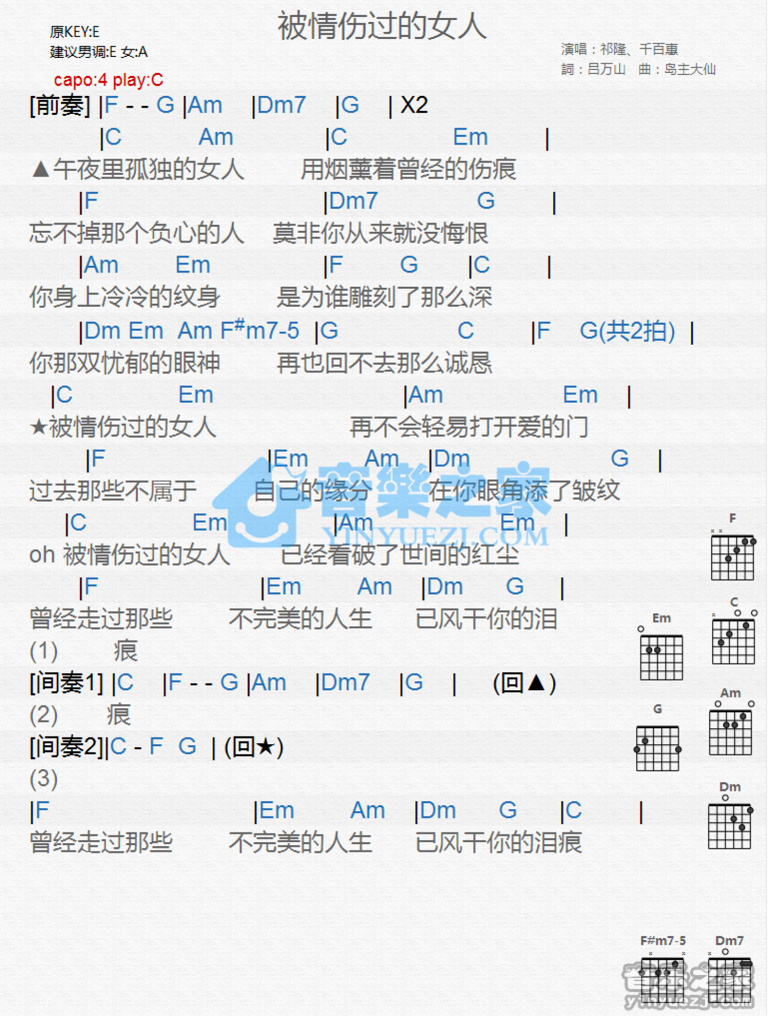 曲谱介绍: C调版《被情伤过的女人》吉他和弦弹唱谱