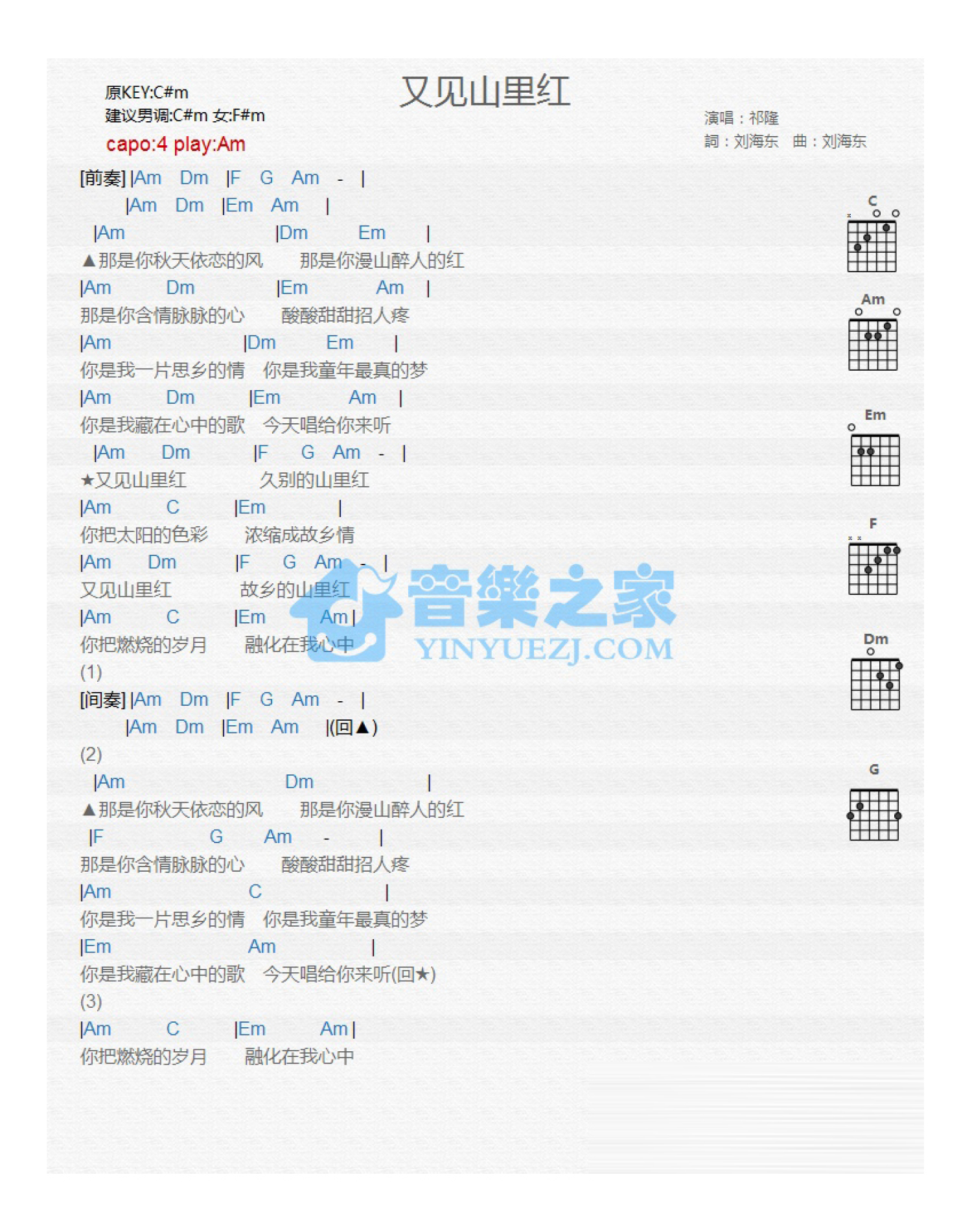 曲谱介绍: A调版《又见山里红》吉他和弦弹唱谱