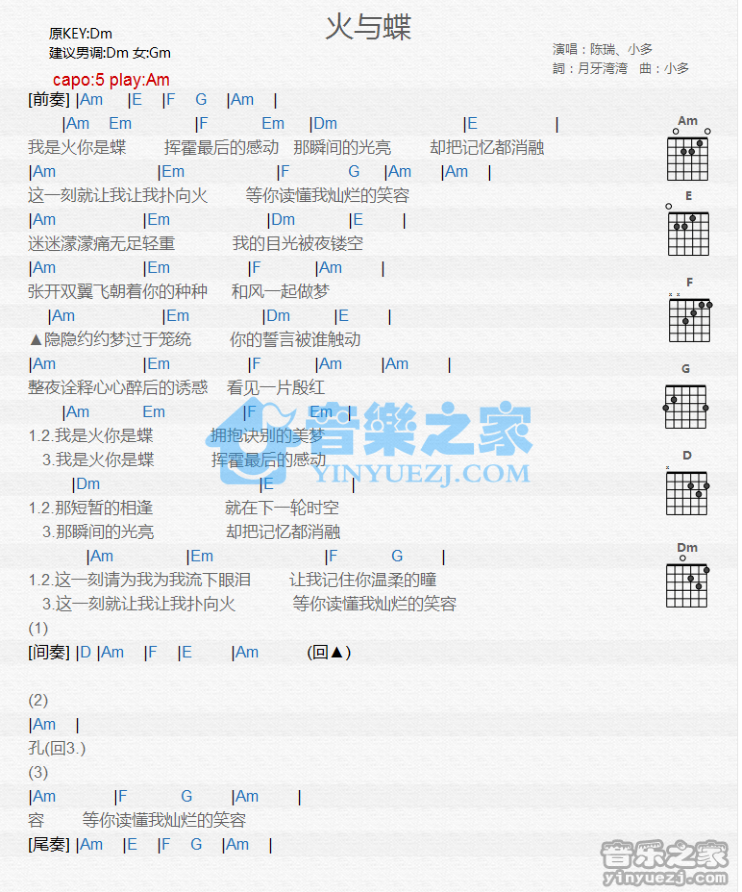 曲谱介绍: Am调版《火与蝶》吉他和弦弹唱谱
