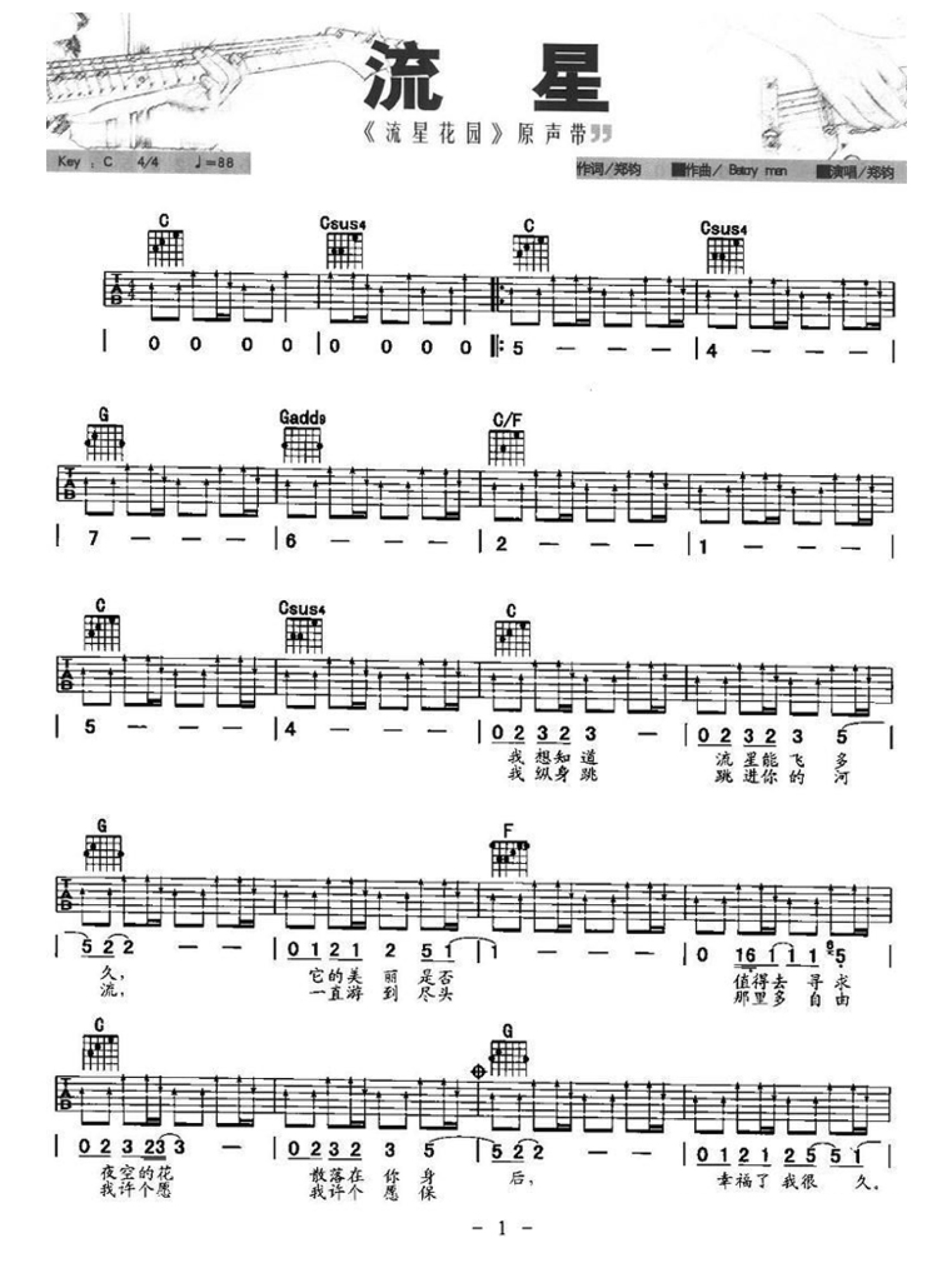 曲谱介绍: 【流星吉他谱/六线谱】郑钧 流星吉他谱/六线谱