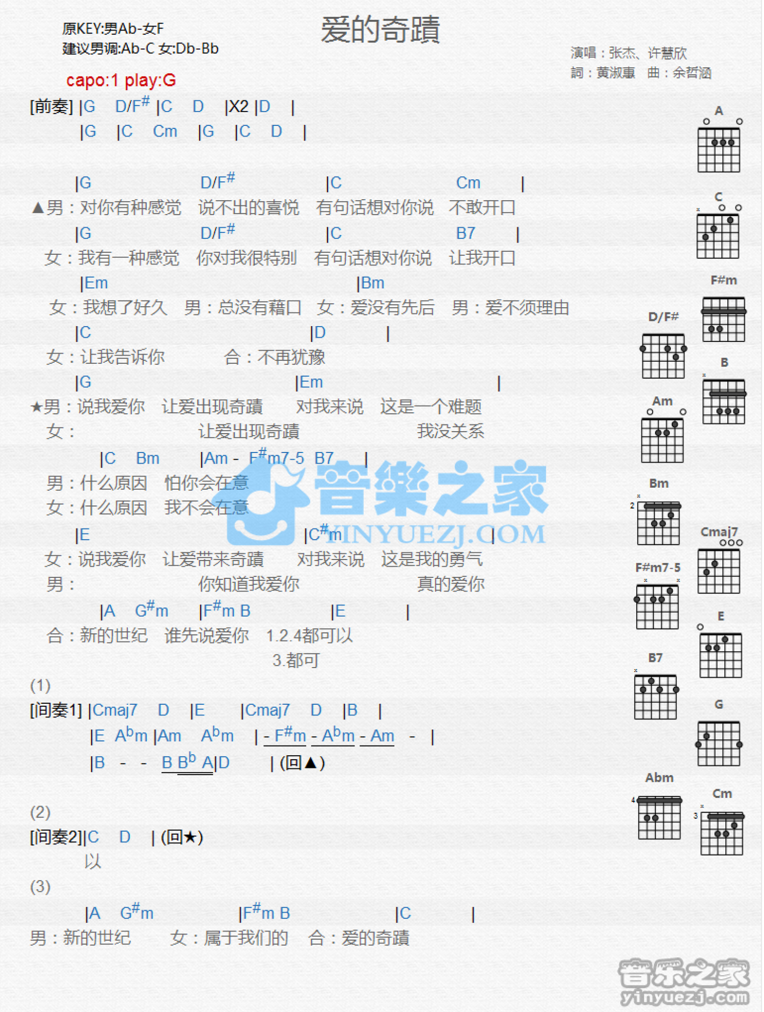爱的奇迹吉他谱 - 张杰/许慧欣 - G调吉他弹唱谱 - 和弦谱